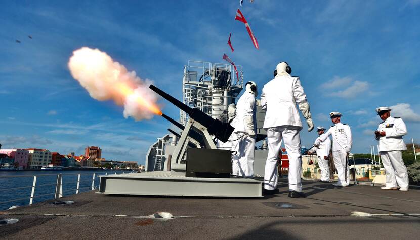 Koningsdag is voor de krijgsmacht meer dan een vrije dag of een bezoek aan een festival of vrijmarkt. De krijgsmacht voelt zich van oudsher verbonden met het koningshuis en laat dat ook dit jaar weer weten. Bijvoorbeeld via een bijzonder appèl, al dan niet met het zogenoemde 'joelen', maar ook door saluutschoten af te vuren. Dat deed de bemanning van Zr.Ms. Pelikaan om 08.00, 12.00 en 16.00 uur met in totaal 101 schoten. Het schip lag voor de gelegenheid afgemeerd aan de Mathey Werf in Otrabanda, Curaçao.