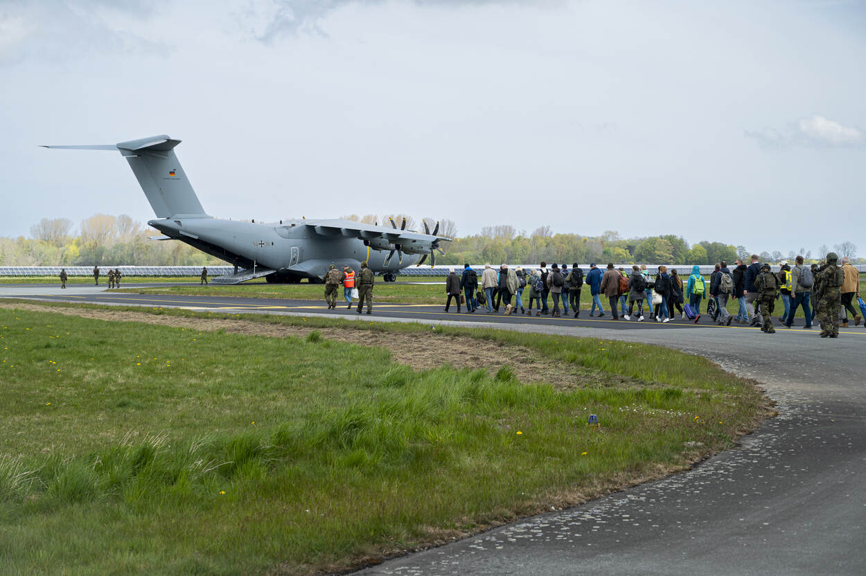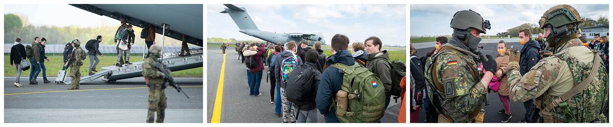 Ondertussen zorgen militairen van 11Luchtmobiele Brigade voor de veiligheid terwijl ze de menigte begeleiden naar het transportvliegtuig van de Luftwaffe. In een mum van tijd wordt een afstand afgelegd die met de auto twee uur rijden is. De eerste dag zit erop.