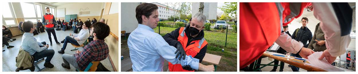 De menigte houdt geen rekening met de Deutsche Gründlichkeit. Er staan weliswaar dranghekken om de menigte gestroomlijnd te begeleiden, maar er houdt slechts één dame toezicht. Die wordt snel geconfronteerd met het gegeven dat vluchtelingen geen geduld kunnen opbrengen. Binnen no-time duwen hordes mensen tegen de hekken.