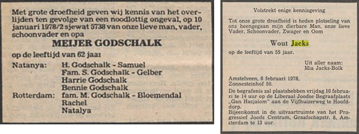 Per toeval stuit Martijn Brandjes tijdens zijn werk als bouwhistoricus op een lang bewaard dossier over de Amsterdamse Patroclosstraat 24-1 waarin de naam van de familie Jacks als vroegere bewoners van het pand worden genoemd. Zijn vrouw Linda weet als amateur genealogisch onderzoeker aardig de weg in de nationale- en streekarchieven. Samen duiken ze in de geschiedenis van de Joodse familie. In vier jaar tijd bouwt het duo een dik dossier op over Wout Jacks. Het is via deze weg dat ze tevens gelinkt worden aan Meijer Godschalk. “Het onderzoek is een beetje uit de hand gelopen qua omvang”, erkent Linda. “Maar dit zijn zulke bijzondere verhalen; die verdienen het om gelezen en doorverteld te worden.”