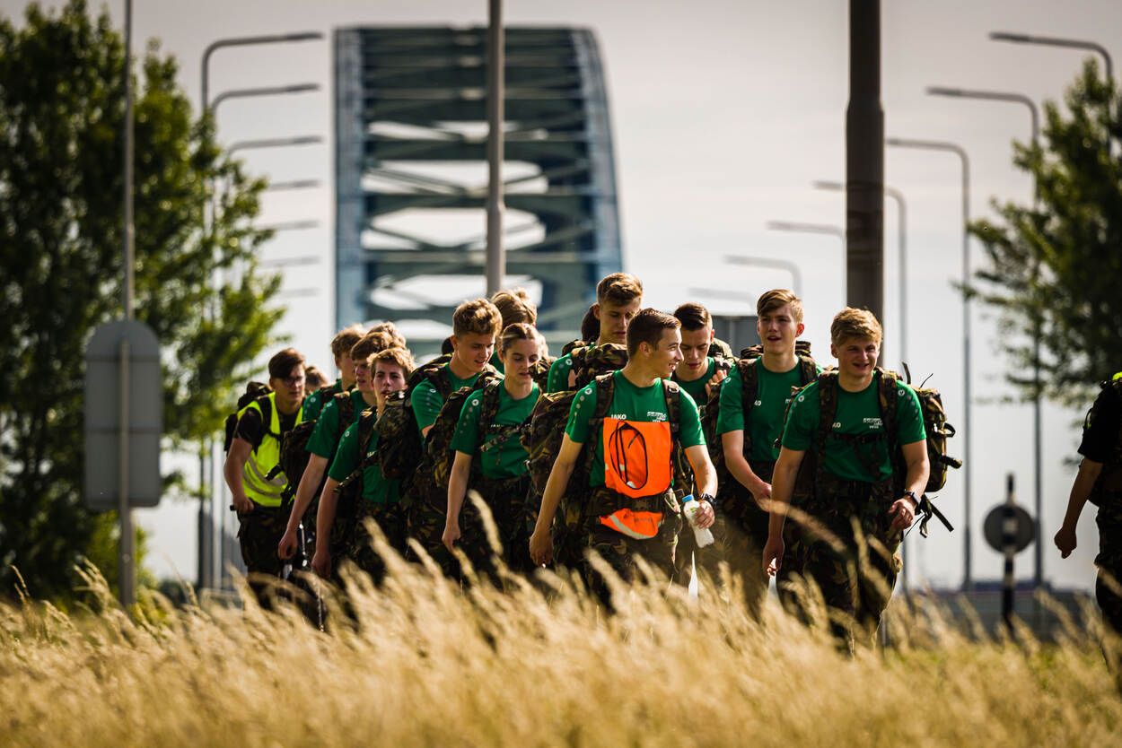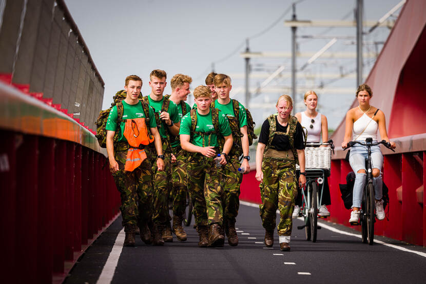 “Het is goed te doen”, zegt Thijs (“Ik wil bij de Koninklijke Marechaussee”) bij de eerste rustplaats, zo’n acht kilometer onderweg. Zijn ‘maten’ Fabian (“...naar het Korps Mariniers”) en Merlijn (“...zeker naar de Pantsergenie”) rusten wat in de schaduw. “Er is een lekker briesje, dat maakt het plezieriger”, zegt hij.