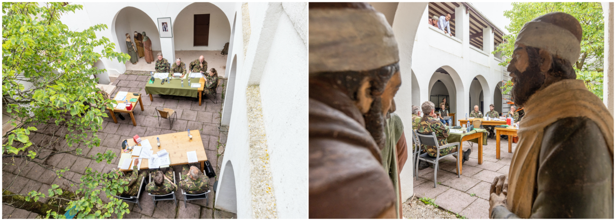 Met het scherpe geluid van schuivende stoelen op de achtergrond gaat het publiek staan. De militaire rechtbank komt binnen: échte militair rechters stappen de binnenplaats op. Klaar staan de Officier van Justitie en de geacteerde verdachte met z’n raadsman. Iedereen, op de verdachte na, is reservist. Ze betreden geen statig gerechtsgebouw in een van de grote steden, maar staan ergens in de heuvels van Heilig Landstichting. De plaats waar oud-premier Dries van Agt jarenlang woonde.