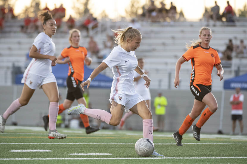 “Helaas waren de Fransen een maatje te groot en hebben we met 0-8 verloren”, erkennen de vrouwen van het Nederlandse militair voetbalelftal. Net als bij het 'gewone' EK voetbal dat momenteel wordt afgewerkt, kent het wereldkampioenschap vrouwenvoetbal voor militairen van het Conseil International du Sport Militaire (of kortweg CISM) ook dergelijke monsteruitslagen. De defensieve tactieken mogen dus nog wel wat geoefend worden...Nog tot 24 juli neemt de damesvoetbalploeg van Defensie deel aan de Women’s World Football Cup in de Verenigde Staten. Zet 'm op dames! (Foto: EJ Hersom).