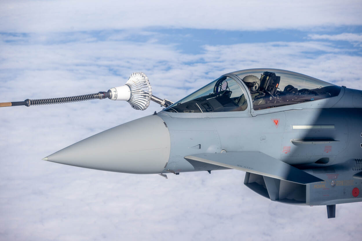 Ditzelfde kunstje wordt gedaan door twee Duitse Eurofighters. Zij tanken niet middels de boom, maar via hose and drogue onder de vleugel. Een techniek die misschien wel het beste te vergelijken is met een bij die op een bloem afvliegt en z’n tong in de nectar hangt en opzuigt.