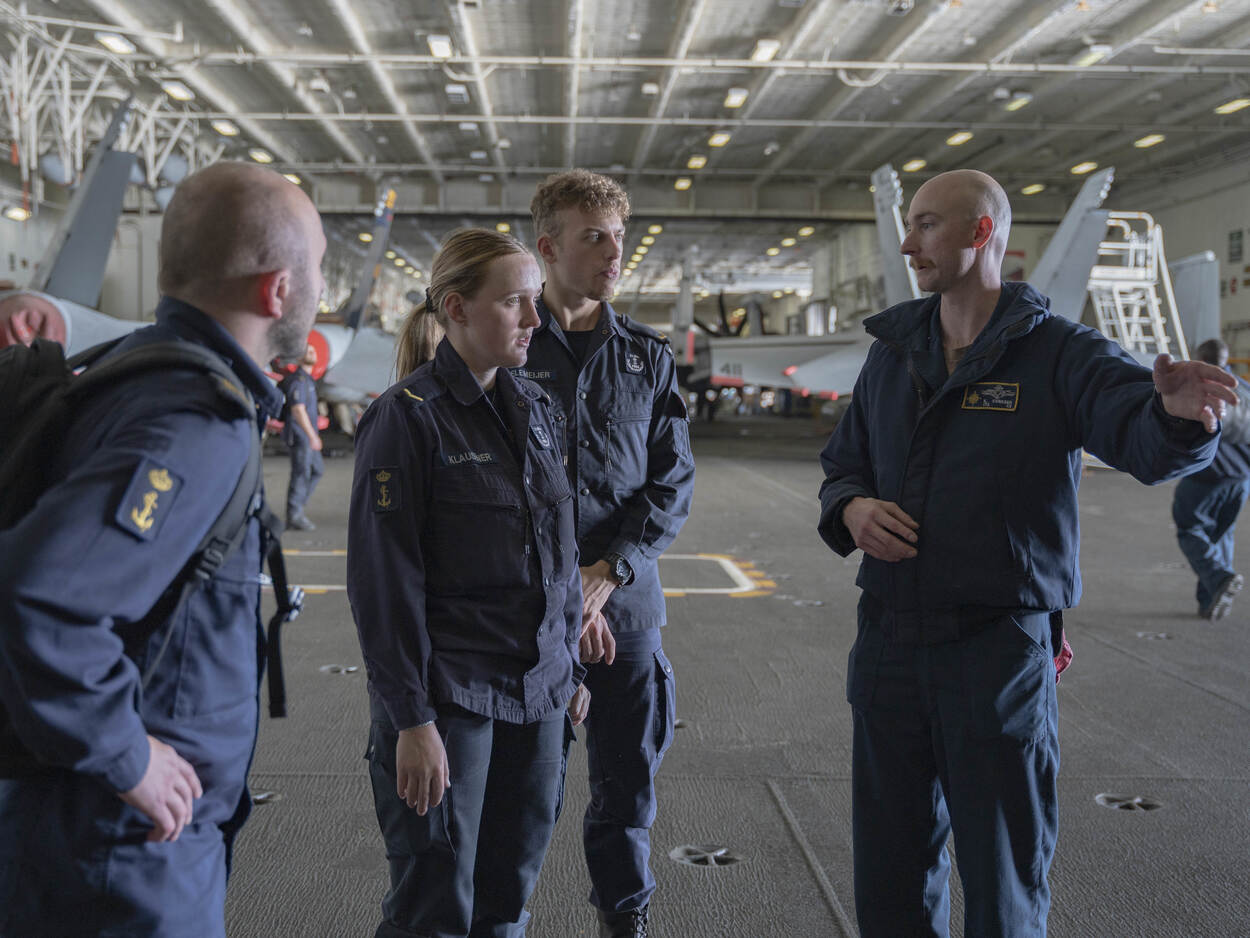 Een van de voordelen van samen oefenen; personeel van het Nederlandse fregat De Zeven Provinciën (F802) krijgt een tour aan boord van de USS Gerald R. Ford. Techneut 2e klasse Informatie Systemen Shane Sonksen geeft uitleg over het reilen en zeilen aan boord van dit nieuwste vliegdekschip. De foto werd genomen door de ‘Mass Communication Specialist’ 1st Class Ryan Seelbach.