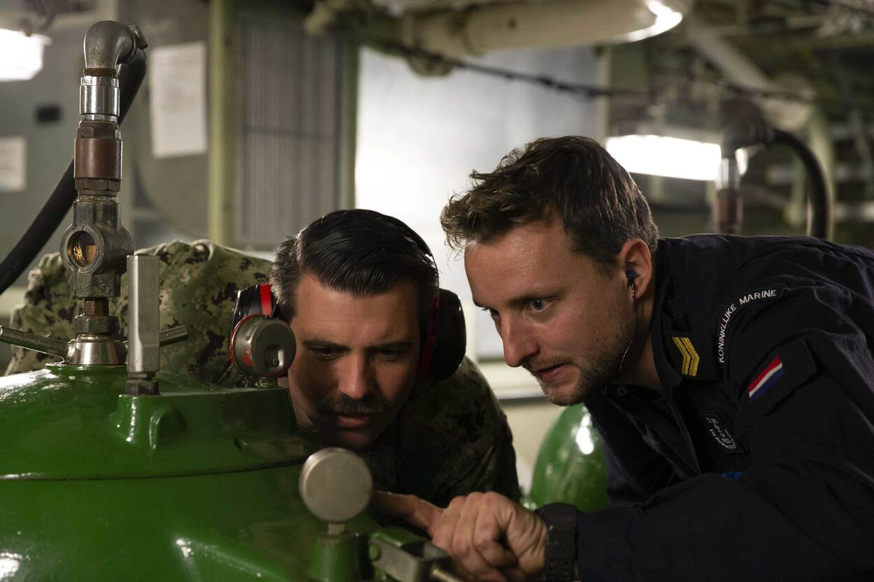 Mass Communication Specialist 3rd Class Jacob Mattingly legt vast hoe fire marshall Jeremy Luallen op zijn beurt weer uitleg krijgt van korporaal Niels Bos over het machinepark aan boord van Zr.Ms. De Zeven Provinciën. Tijdens deze zogenaamde 'crossdeck visits' krijgen opvarenden van alle rangen de mogelijkheid een dagje aan boord van de andere schepen te kijken om zo de interoperabiliteit te bevorderen.