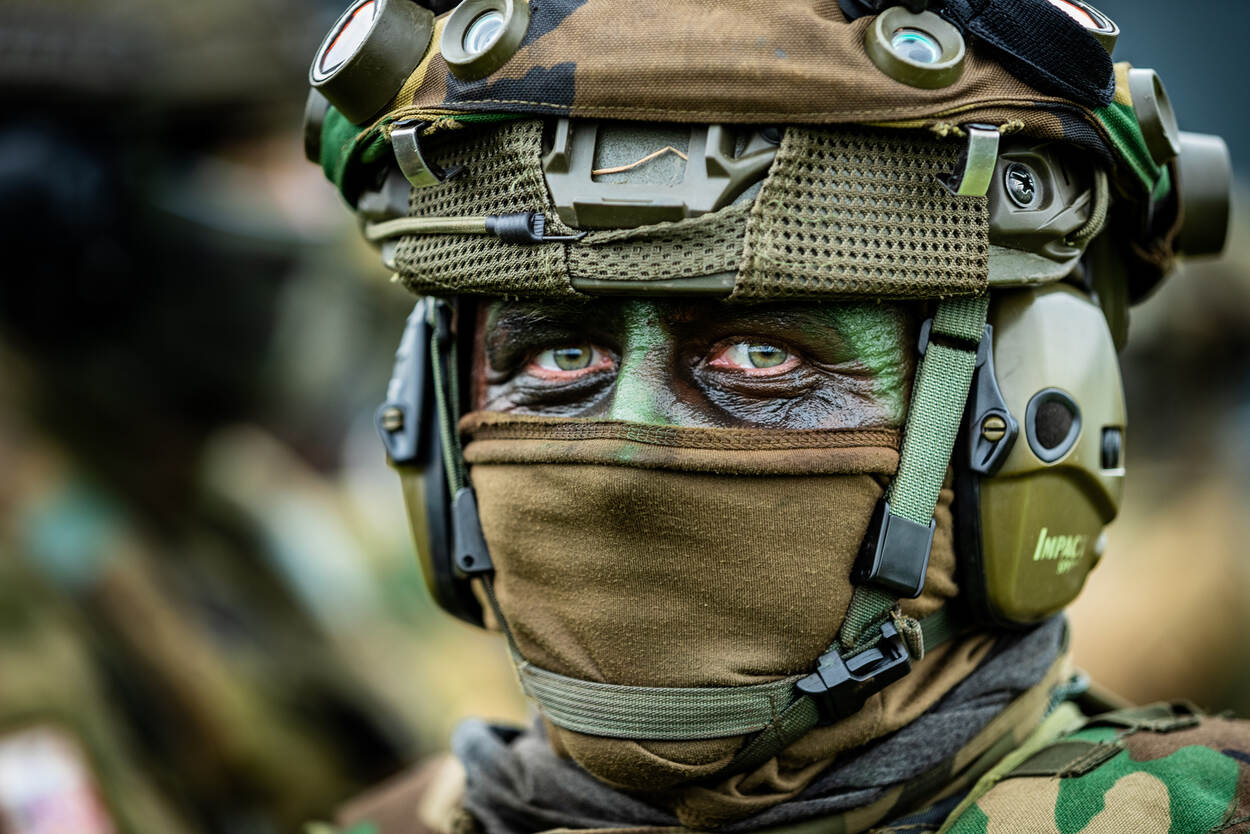 ... is iemand die vaak onder moeilijke omstandigheden waar maakt wat Defensie belooft: beschermen wat ons dierbaar is. Om dat goed te kunnen doen moet er flink geoefend worden. Deze indrukwekkende militair doet dat tijdens Falcon Autumn in de omgeving van Drachten. Foto: sergeant-majoor Cristian Schrik.