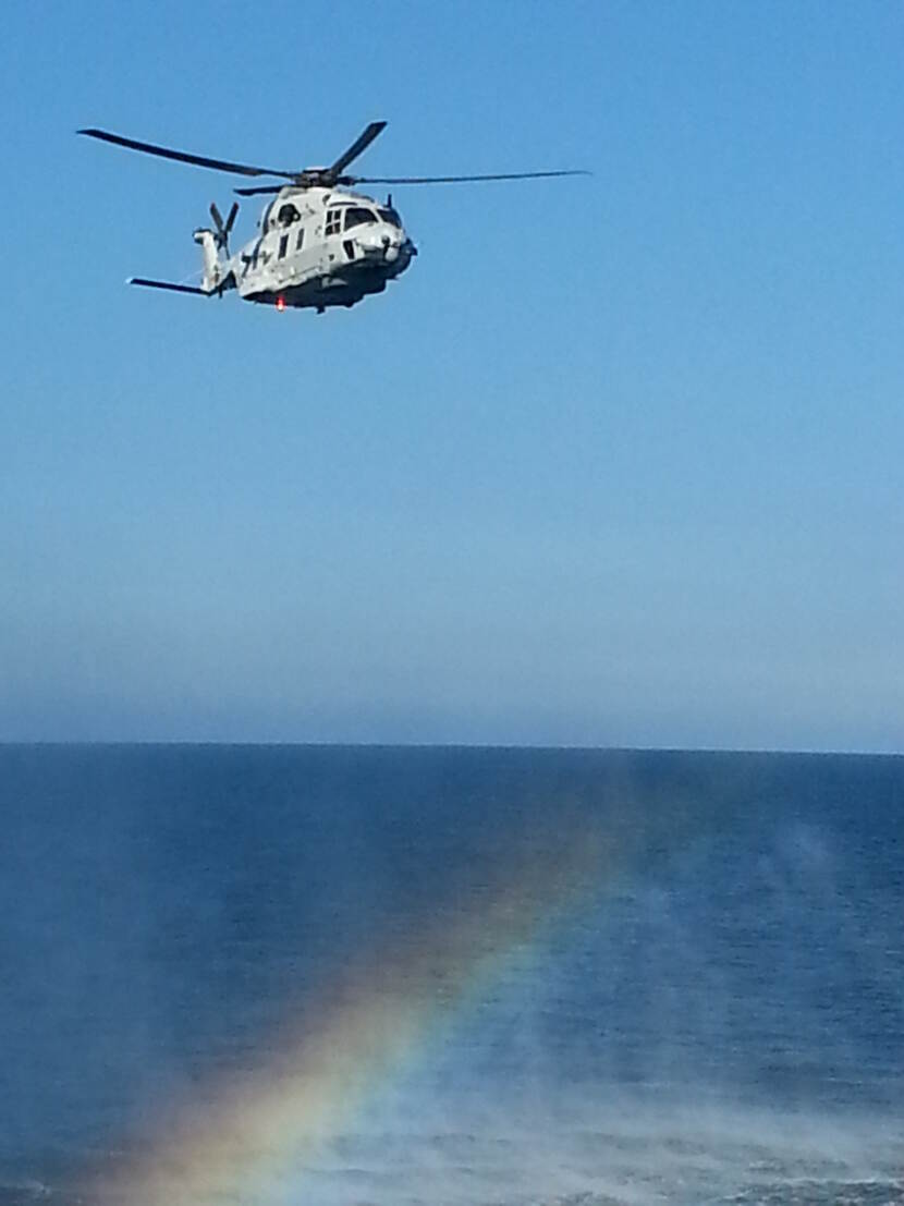 De deelnemers aan de (familie)vaart op Zr.Ms. Rotterdam troffen het. Naast een uitgebreid programma kregen ze nog een extraatje voorgeschoteld. Paul Calis, maker van deze foto, meldt: “tijdens een vlucht van de NH-90 gaf de regenboog wat extra allure aan deze toch al zonnige dag.” Inclusiever kan bijna niet!