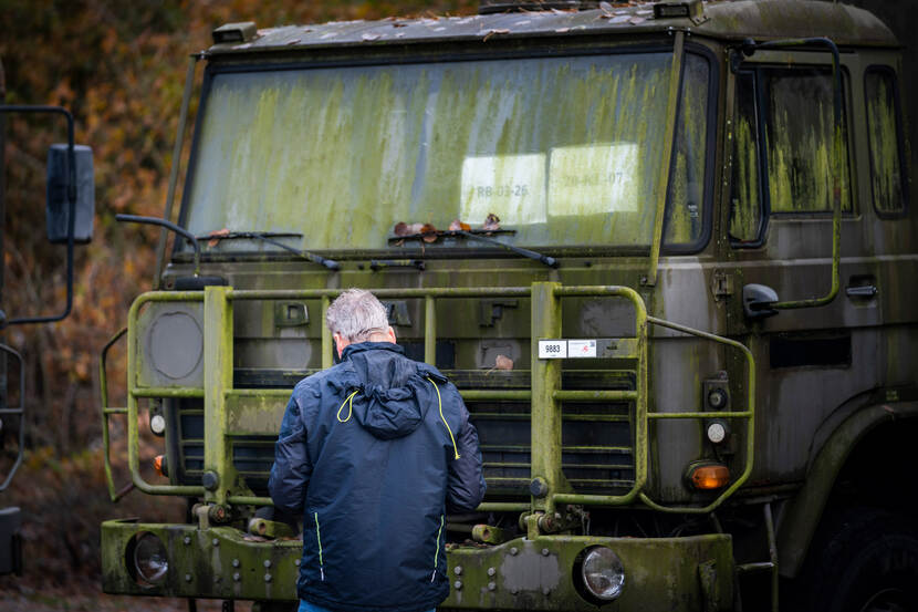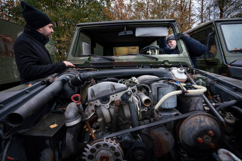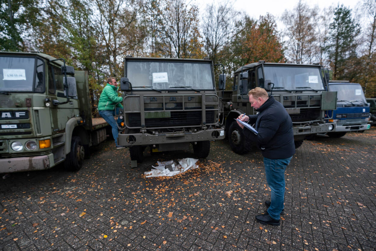 John en z’n concullega Dick van Dam staan aandachtig bij een oude tientonner te kijken. De twee komen elkaar al veertig jaar tegen op defensieveilingen. “Het is jammer dat je tegenwoordig alles per stuk moet kopen. Mijn vader begon vijftig jaar geleden in dit vak en kocht dan achthonderd defensievoertuigen in één keer op”, maakt Dick duidelijk. Omdat dit in Nederland niet snel meer gebeurt, gaan hij en John liever naar buitenlandse veilingen. “Vooral die in Zweden", voegt hij toe. “Dan krijg je zelfs een reparatierapport, waarin staat hoeveel het kost om een bepaald voertuig op te knappen.”