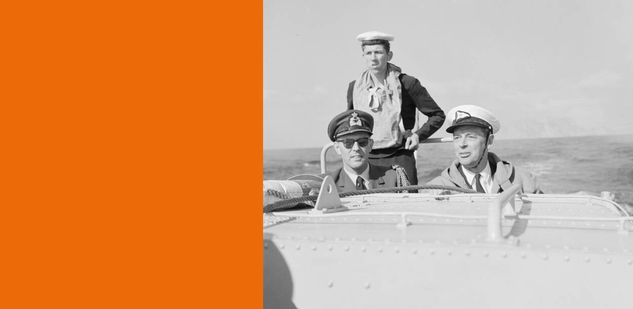 Bron: Defensie. Foto onder: Rudi Hemmes (links) als adjudant van de toenmalige defensieminister Visser (1961).