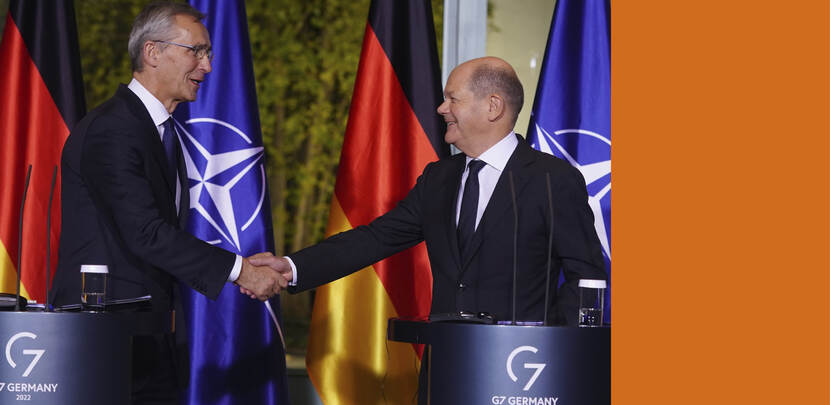Bron: BELGA - foto: ANP (De Duitse bondskanselier Olaf Scholz en secretaris-generaal van de NAVO Jens Stoltenberg)