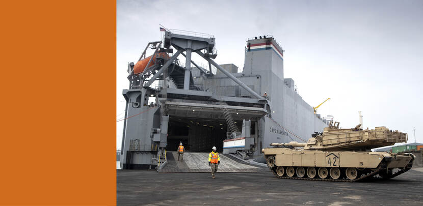 Bron: Defensie. Foto: maart 2022 van een M1 Abrams-gevechtstank die arriveert in Vlissingen.