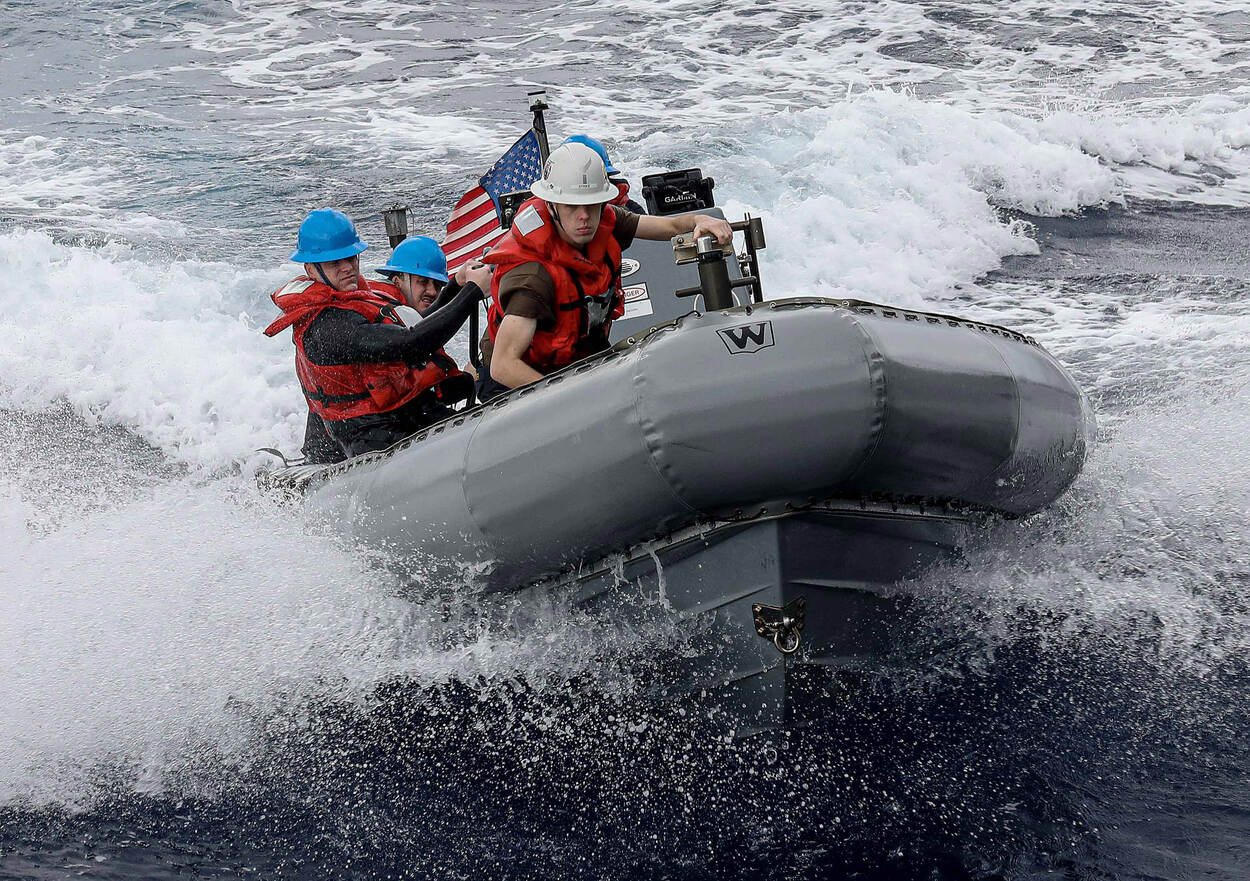 Matrozen van het geleide-wapenfregat USS Rafael Peralta trainen met een rigid-hull inflatable boat (RHIB) een zogenoemde ‘man overboord procedure’ in de Filipijnse Zee. Het fregat van de Arleigh Burke-klasse maakt deel uit van Task Force 71/Destroyer Squadron (DESRON) 15 van de Zevende Vloot. Foto: U.S. Navy, Mass Communication Specialist 1st Class Greg Johnson.