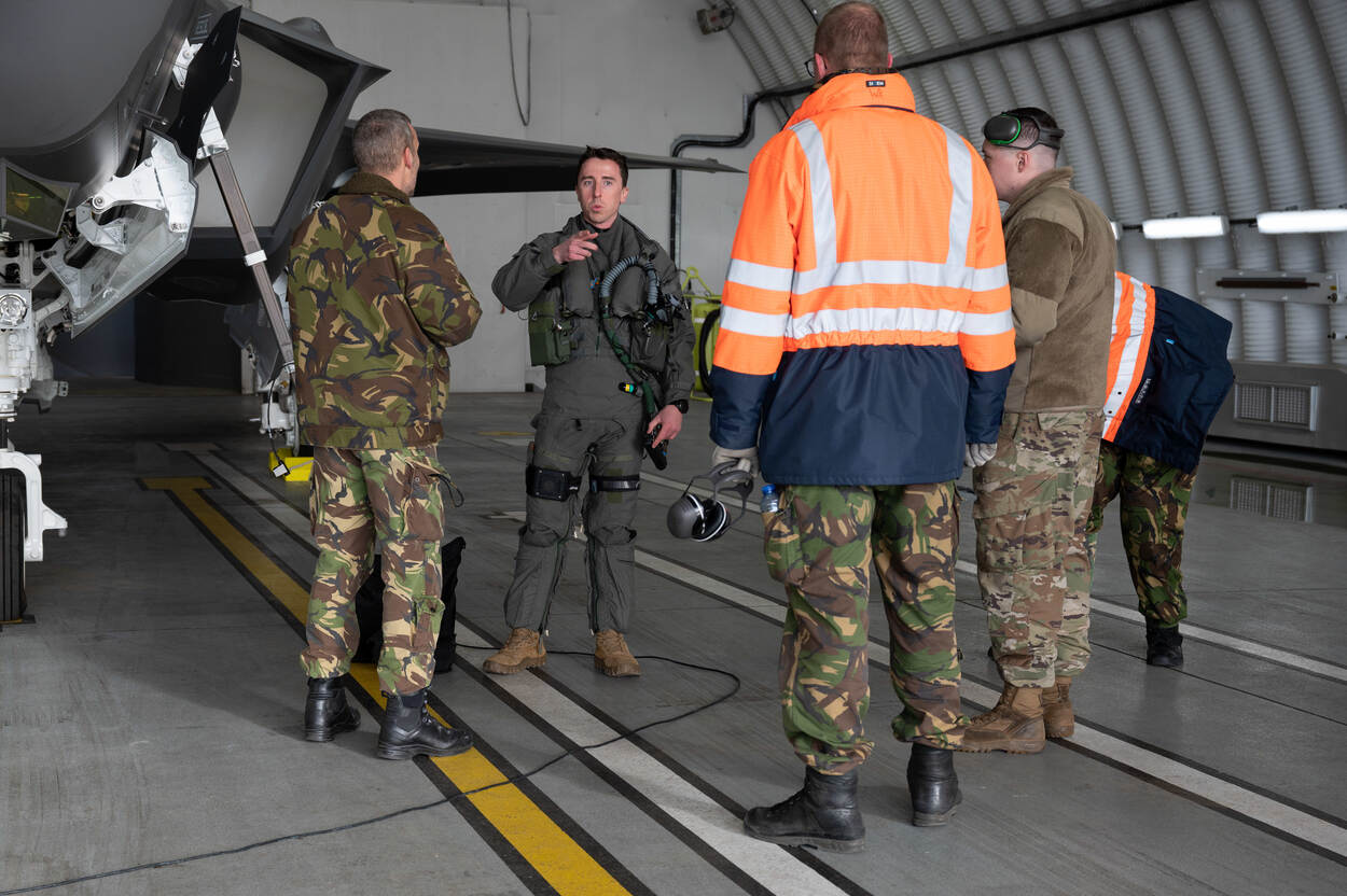 Nederlands luchtmachtpersoneel debrieft een vlieger van 495th Fighter Squadron van de US Air Force tijdens een F-35 cross-service training op de Engelse basis Lakenheath. Op beeld vastgelegd door airman 1st Class Seleena Muhammad-Ali. Het squadron maakt deel uit van 48 Fighter Wing, ook wel Liberty Wing. Het is tot op heden de enige eenheid binnen de U.S. Air Force die wordt aangeduid met zowel een naam als een nummer.
