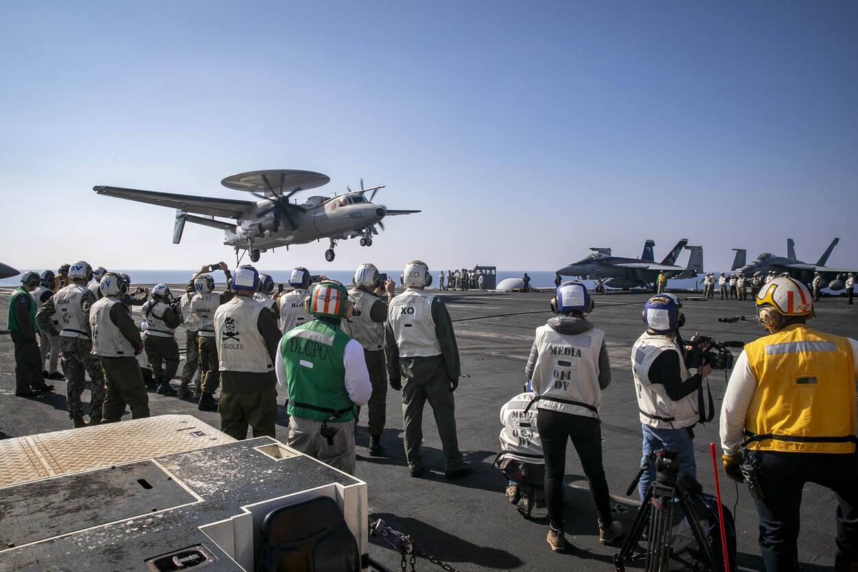 Naast militaire leiders van de Verenigde Staten en Israël volgt ook de internationale pers met argusogen de oefening Juniper Oak. Zo wordt hier de landing van een E-2D Hawkeye op het dek van de Nimitz-klasse USS George H.W. Bush (CVN 77) geobserveerd. Juniper Oak is een jaarlijks terugkerende, bilaterale oefening van U.S. Central Command en de Israeli Defense Force. Bedoeld om de interoperabiliteit te vergroten. De foto werd genomen door Communication Specialist 3rd Class Nicholas Avis.