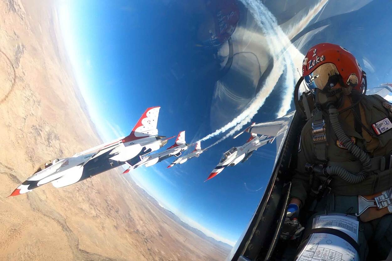 Je hebt kantoren met een aardig uitzicht, maar weinig werkplekken kunnen wedijveren met het uitzicht dat de vliegers van het Amerikaanse demonstratieteam Thunderbirds dagelijks hebben. Of ze veel tijd krijgen om daarvan te genieten is maar de vraag, want om zo dicht bij elkaar allerlei spectaculaire manoeuvres te vliegen, vraagt om opperste concentratie. Gelukkig kunnen ook wij meegenieten. Foto: U.S. Air Force, Tech. Sgt. Nicolas Myers.