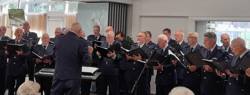 Een na(ver)brandertje, om maar in luchtmacht-termen te spreken. Deze foto is van eind vorig jaar toen het Luchtmacht Mannenkoor een optreden verzorgde voor de bewoners van Verzorgingshuis Sint Jan in Uden. De bewoners genoten met volle teugen, al mocht dat vanwege de privacy niet herkenbaar in beeld gebracht worden. Foto: Karin van der Hoeven–Verstegen.