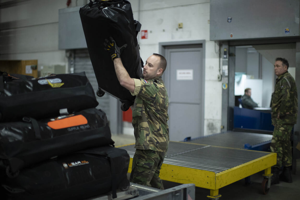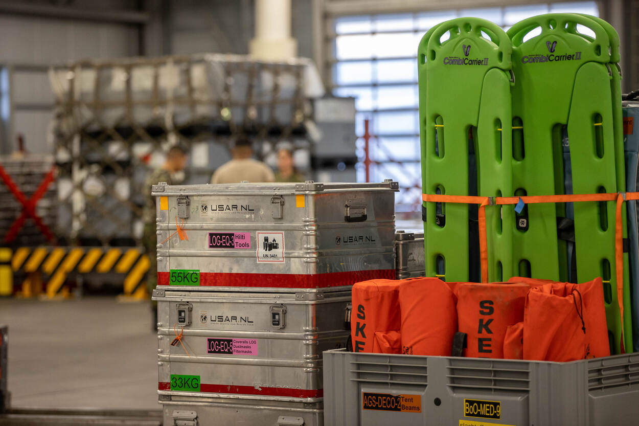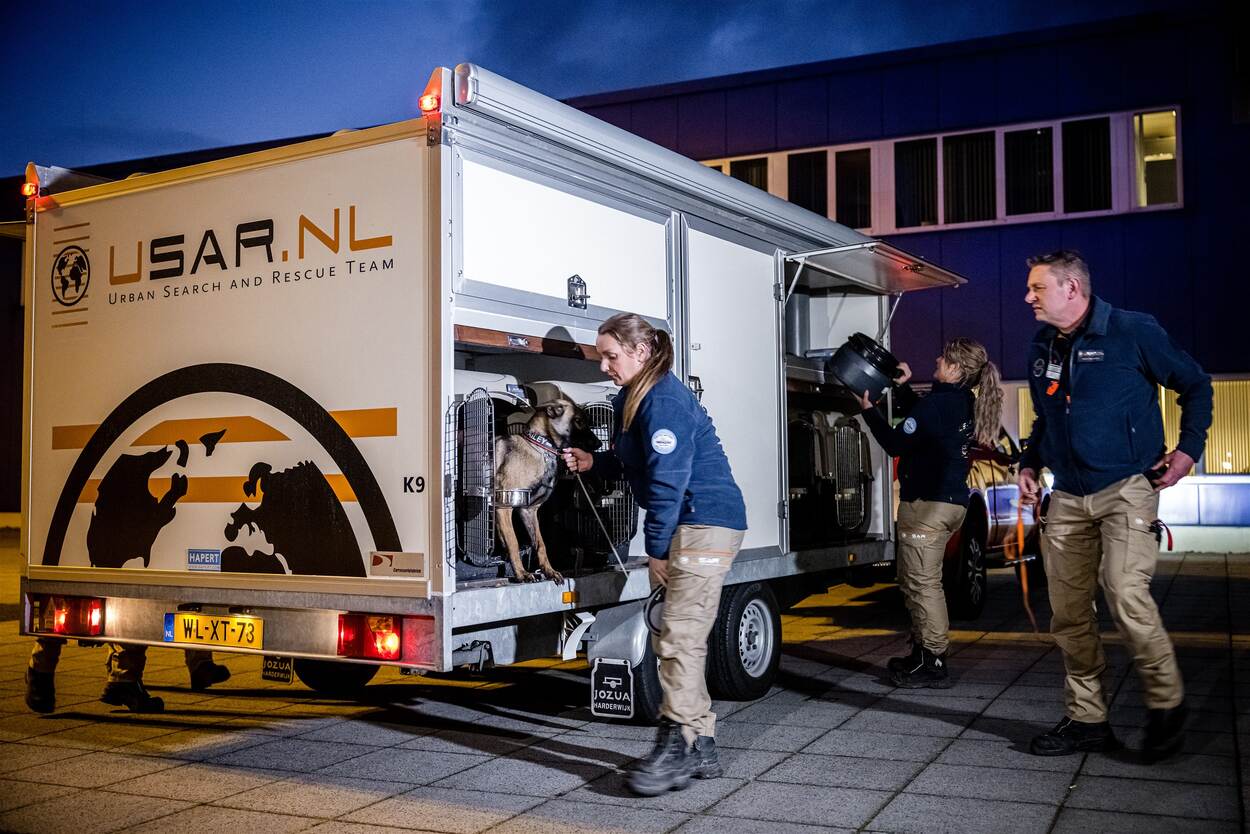 Tientallen pallets worden met grondankers vastgezet aan de laadvloer van de C-17. Tot de rand gevuld met vijftien ton aan onder meer betongereedschap, touwen en netten, brancards, microfoons, lakens en spaden. Ondertussen lopen acht overenthousiaste K-9 speurhonden met hun baas op het platform heen en weer. Zij en de tientallen andere specialisten van het Urban Search and Rescue Team, onder wie een aantal militairen, wachten in de terminal tot hun passagiersvliegtuig gereed is voor vertrek naar het door zware aardbevingen getroffen Turkije.