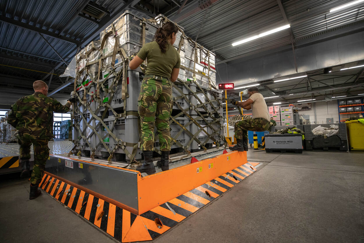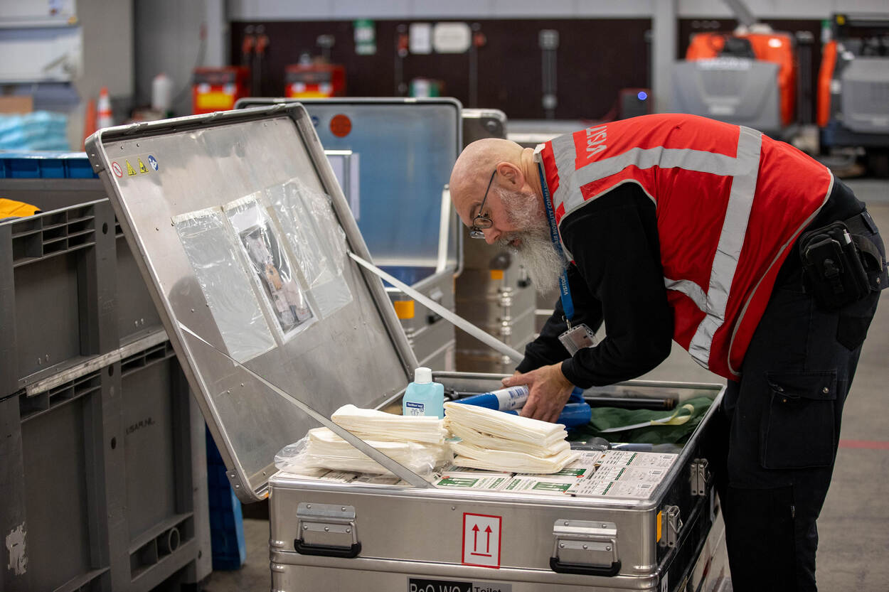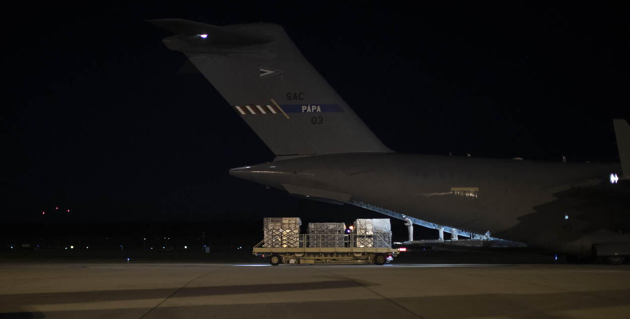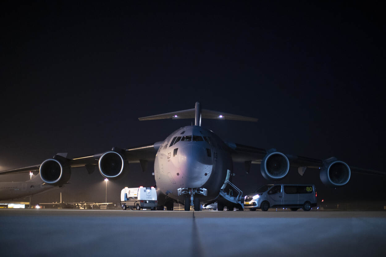 Tientallen pallets worden met grondankers vastgezet aan de laadvloer van de C-17. Tot de rand gevuld met vijftien ton aan onder meer betongereedschap, touwen en netten, brancards, microfoons, lakens en spaden. Ondertussen lopen acht overenthousiaste K-9 speurhonden met hun baas op het platform heen en weer. Zij en de tientallen andere specialisten van het Urban Search and Rescue Team, onder wie een aantal militairen, wachten in de terminal tot hun passagiersvliegtuig gereed is voor vertrek naar het door zware aardbevingen getroffen Turkije.