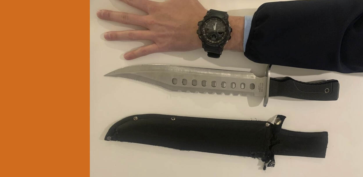 De man liep samen met enkele anderen rond op Schiphol. De groep viel op door hun gedrag. Ze werden door marechaussees aangesproken en gecontroleerd. Bij de controle van de man werd in zijn broeksband een groot mes aangetroffen. Hierop is hij aangehouden en is het mes in beslag genomen