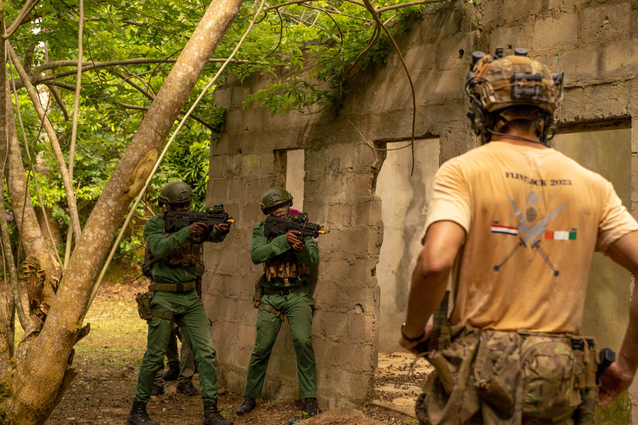 Een groepje militairen uit Ivoorkust staat klaar om een verdacht gebouw binnen te gaan. Met hun wapens in de aanslag gaan ze omzichtig te werk en krijgen ze aanwijzingen van een Nederlandse instructeur. Een spannend moment in de grote Amerikaanse training Flintlock 2023. Doel van de serie oefeningen is de samenwerking met Afrikaanse krijgsmachten te vergroten. Foto: Technical Sergeant Katelynn Moeller, U.S. Air Force.