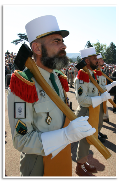 Tijdens de parades op 14 juli vormen de sappeurs van het Franse Vreemdelingenlegioen, allemaal getooid met baard, een bijzondere verschijning. Met een leren schootsvel over hun uniform, witte handschoenen aan en met een bijl over de rechterschouder, maken deze mannen tijdens de parade als het ware de weg vrij van obstakels voor de rest van het legioen. Net zoals zij dat in de beginperiode van het legioen deden.