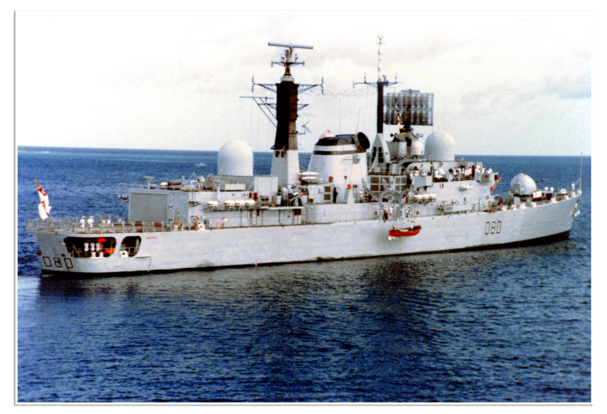 HMS Sheffield wordt twee dagen na het zinken van de Belgrano midscheeps getroffen door een Exocetraket, die vanaf 32 tot 45 km wordt afgevuurd door een Argentijns Super Étendard jachtvliegtuig. Na het zinken van de Sheffield trekken de grootste schepen van de Britse vloot (de vliegkampschepen HMS Invincible en Hermes) zich terug tot buiten het bereik van de Argentijnse vliegtuigen. Alleen de fregatten voor de beschieting van Argentijnse posities en troepentransportschepen zijn zo nog doelwit van de aanvallen door de Argentijnse luchtmacht.