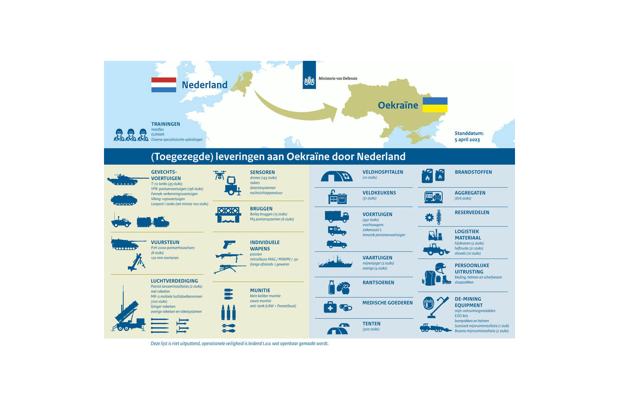 Het ministerie van Defensie maakt voortaan meer informatie openbaar over militaire leveringen aan Oekraïne. Aan die belofte werd direct gevolg gegeven door bekend te maken wat voor type goederen en middelen de krijgsmacht inmiddels heeft geleverd aan Oekraïne. Tot nu toe gaat het om militaire steun met een waarde van 1,2 miljard euro.