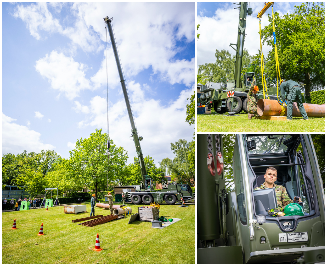 Het ochtendprogramma bestaat uit veel theorie over zwaartepunten en verschillende kleuren banden voor het hijswerk. Een deel van het terrein op Bronbeek is dan al bezet door kranen en materiaal van de genie, dat met zes specialisten is uitgerukt. Korporaal Thomas (102 Constructiecompagnie) is met ‘zijn’ nieuwe LTM 1055 vanuit Wezep komen rijden en er is een spider crane uit Duitsland ingehuurd.