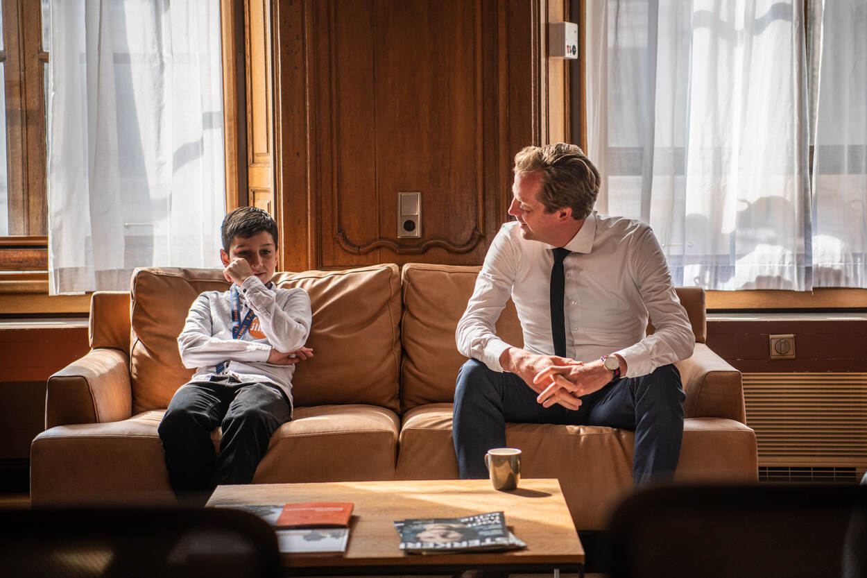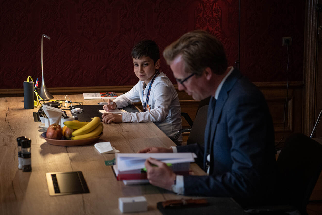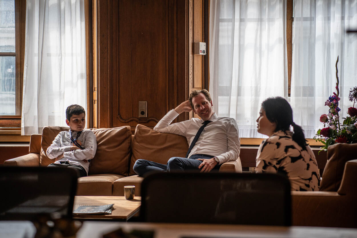 Voor hem zitten Tuana en Sami. De leerlingen uit groep 8 werden diezelfde ochtend van school opgehaald door de marechaussee, waarna ze ontbeten in de werkkamer van de staatssecretaris. Die vraagt de jonge mensen om hulp, want hij zoekt personeel.
