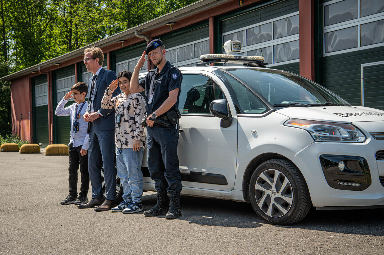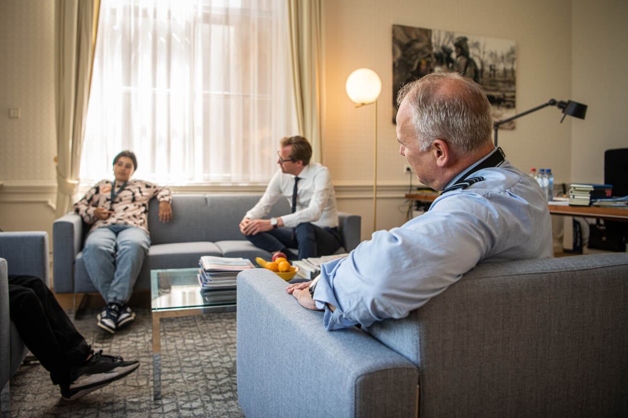 Staatssecretaris Christophe van der Maat: “Vandaag zijn jullie de hoogste baas van de Nederlandse krijgsmacht. De grootste organisatie van Nederland, want hier werken 70.000 mensen.” Vragen te over bij de tieners over hun nieuwe baan en werkplek: “Is er een ondergrondse gevangenis? Een geheime wapenkamer?” Of: “Nederland heeft geen tanks? Ik zag op het Jeugdjournaal dat Nederland tanks had gegeven aan Oekraïne. Waar kwamen die vandaan dan?” Bij hun rondleiding op het ministerie brachten Tuana en Sami onder andere een bezoek aan het hoofd Directie Personeel en de échte baas van alle militairen in Nederland: Commandant der Strijdkrachten generaal Onno Eichelsheim. “Toen ik zo jong was als jullie had ik nog geen idee dat ik later zou gaan vliegen; of dat ik überhaupt bij de krijgsmacht wilde werken.” Met het personeelsvraagstuk helpt hij de tieners een eindje op weg: “Ik denk dat we jongeren meer moeten vertellen wat ons werk allemaal inhoudt. In de klas en ver daarbuiten, om te laten zien dat Defensie meer is dan enkel werken met wapens.” Wat wel eens wordt vergeten? “Kameraadschap is ontzettend belangrijk voor ons. Als je spannende dingen doet en veel meemaakt samen, maak je ook snel vrienden.” Met deze wijsheid en een commander’s coin op zak gaan de jongeren op pad. Waarom jongeren Defensie niet weten te vinden, is Sami vooralsnog een raadsel, want: “Het leger doet coole dingen. Al zie ik hier en daar wel meer computers dan ik had verwacht.” Kwesties zijn moeilijk op te lossen als je de organisatie niet kent. Tijd voor een kijkje achter de schermen! De marechaussee opent de poorten van mobilisatiecomplex Maaldrift in Wassenaar. Bij een bezoek aan de ‘agenten van het leger’ leren de jongeren over de beveiligings- en de politietaak. Ook de voortuigen buiten baren opzien. Daar staat namelijk een deel van het wagenpark van de Koninklijke Marechaussee, inclusief rupsvoertuig YPR. Breed glimlachend racet het duo over het terrein. Tuana heeft de smaak te pakken. “Tot nu toe het hoogtepunt! Heel leuk. Ik had nog nooit in een tank gereden! Hij ging nog best hard.” Sami oefent vast met de baret. Iets voor de toekomst? “Misschien dat ik later wel bij de marechaussee wil.” Terug naar het ministerie. Peinzend en pennend zitten de ‘bazen’ in het kantoor van de staatssecretaris. Hoe hij jongeren beter zou kunnen bereiken? Meer kranten, nieuws en social media inzetten, denkt Tuana. “Vooral video’s op TikTok en Instagram. Laten zien hoe je bijvoorbeeld met een pistool moet omgaan en uit welke onderdelen het bestaat.” Twitter kun je beter mijden: “Daar zitten vooral oude mensen op.” Dan Sami. Die ziet meer rondleidingen wel zitten. “Voor grote groepen, dan raken veel mensen geïnteresseerd.” Als andere oplossing noemt hij het inzetten van een VR-bril. “Laat mensen zien hoe het is om een dagje militair te zijn.” Voor één dag waren ze de baas van de krijgsmacht. “Best cool”, concludeert Sami, “maar ik besefte het niet echt. Ik hoop wel dat er iets met onze ideeën gebeurt. Zou leuk zijn als wij de uitvinders van die plannen zijn.”