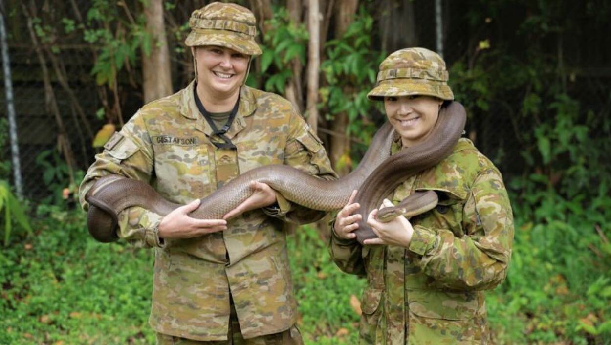 Trots poseren de soldaten Leah Gustafson en Sylvia Ng van het Australische 2nd Health Battalion met een olijfpython. Olijfpythons zijn wurgslangen die meestal reptielen, knaagdieren en vogels op het menu hebben staan, maar de grote exemplaren kunnen zelfs een kangoeroe of hert verorberen. De militairen weten nu in ieder geval wat ze moeten doen als ze een slang zien. De lokale Freek Vonk, in dit geval Euan Edwards, liet de genezeriken zien hoe je de ongevaarlijke van giftige soorten onderscheidt. Het personeel van de Gallipoli Barracks (Brisbane) kreeg vervolgens te horen welke beschermingsmiddelen nodig zijn om ze te vangen. Daarna was er praktijkles in het verplaatsen van de reptielen. De foto is van soldaat Thomas de Weger, die ongetwijfeld zijn roots in ons land heeft.
