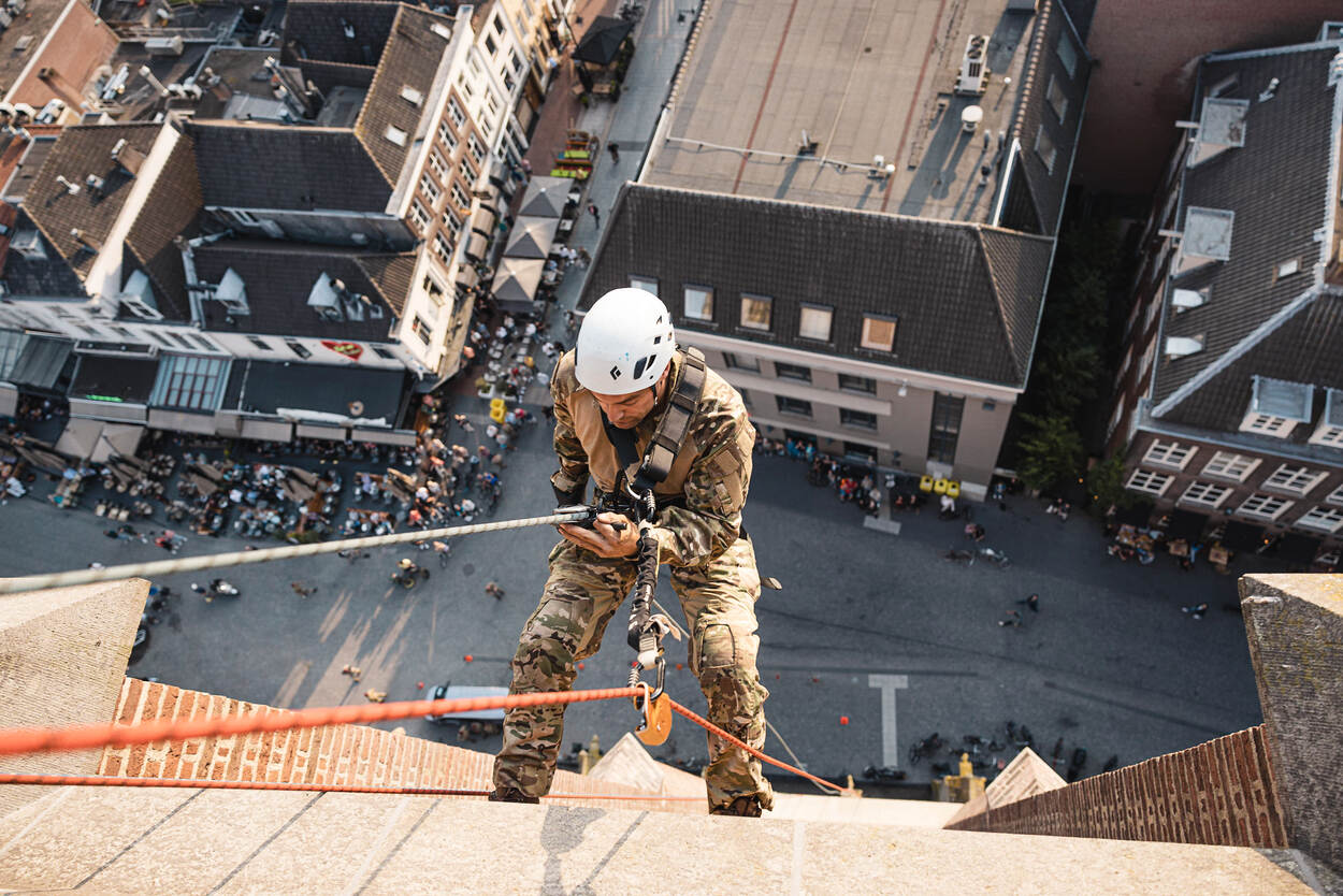 Terwijl winkelend publiek de nodige verkoeling zoekt op een terrasje wordt deze luchtmobieler in Den Bosch het vuur aan de schenen gelegd. Met behulp van een afhangend touw daalt hij af van de 73 meter hoge Sint Janstoren in het hart van het centrum. Het spectaculaire tafereel maakt deel uit van oefening Bevo Seal 2023 waarin optreden in stedelijke omgeving deze week centraal stond. Van sociale patrouilles en voertuigcontroles tot bevoorradingsmissies en uiteraard het abseilen: de militairen hebben het allemaal met succes volbracht. Chapeau! (foto: korporaal Hilbert Buter)
