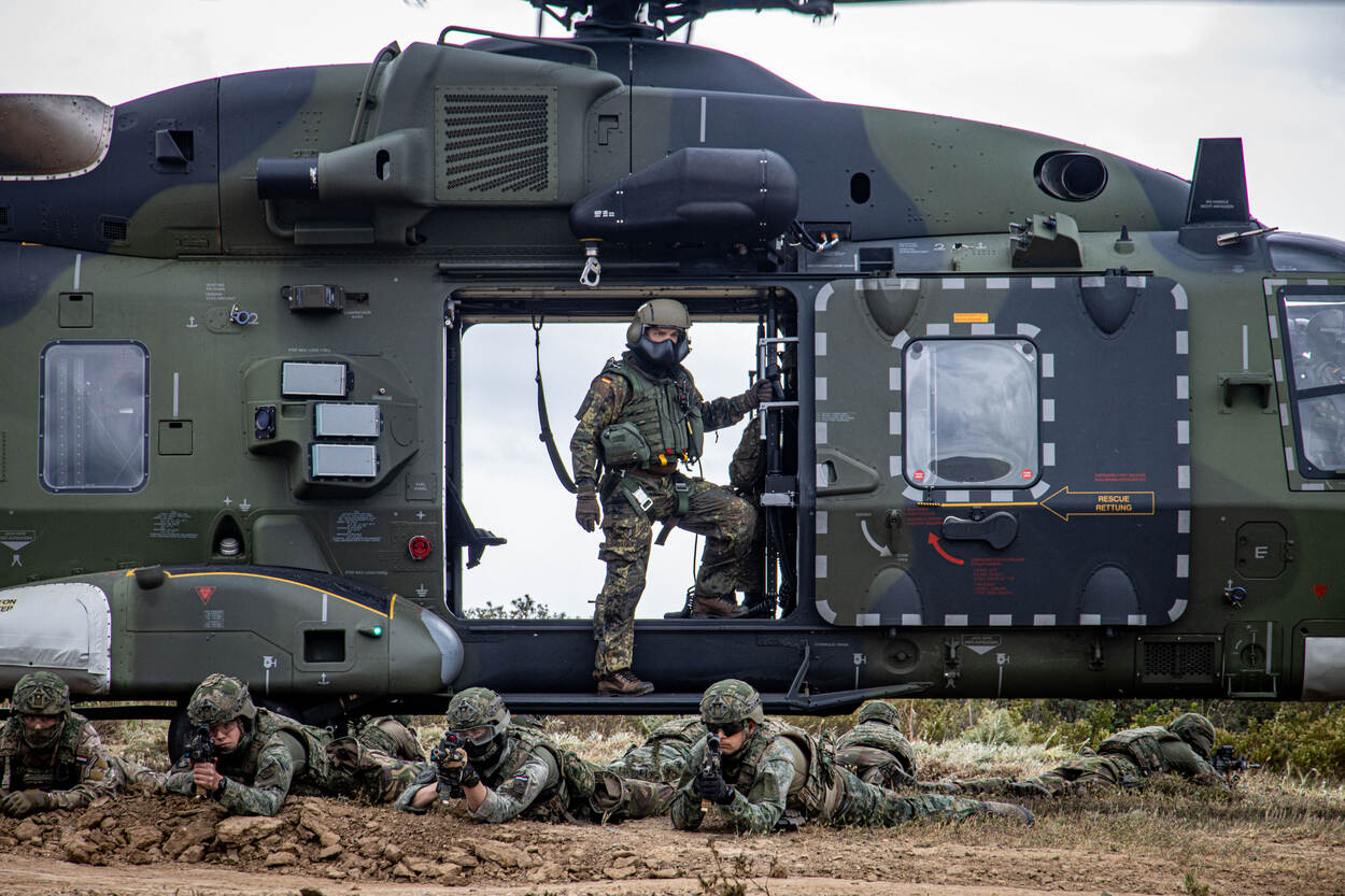 Of je nou uit een vliegtuig springt of uit een helikopter stapt, het moet vooral veilig gebeuren. Dat beoefenden Nederlandse, Noorse en Duitse soldaten onder meer tijdens Noble Jump, waarbij ze onder 'operationele omstandigheden' razendsnel een Duitse NH90 helikopter verlieten. Noble Jump is de naam van een alarmeringsoefening van de snel inzetbare NAVO-flitsmacht, de Very High Readiness Joint Taskforce (VJTF), die werd gehouden op het Italiaanse eiland Sardinië. (foto: korporaal Wessel Zuijderduin)