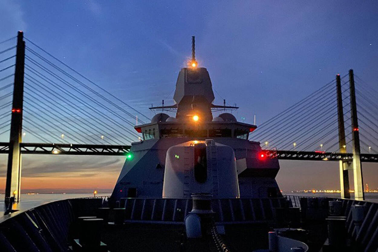 Niet alleen de AWACS-toestellen zorgden voor de beveiliging in Litouwen. Ook de Koninklijke Marine gaf acte de présence. Zr.Ms. De Zeven Provinciën patrouilleerde in de Oostzee voor de Litouwse kust, met de andere schepen van het NAVO-vlootverband SNMG-1. Volgens de Duitse commandant zijn de schepen goed in staat vreemde activiteiten te onderscheiden. Op de foto passeert de '7Prov' de brug over de Sont die Denemarken en Zweden met elkaar verbindt. Foto: Defensie.