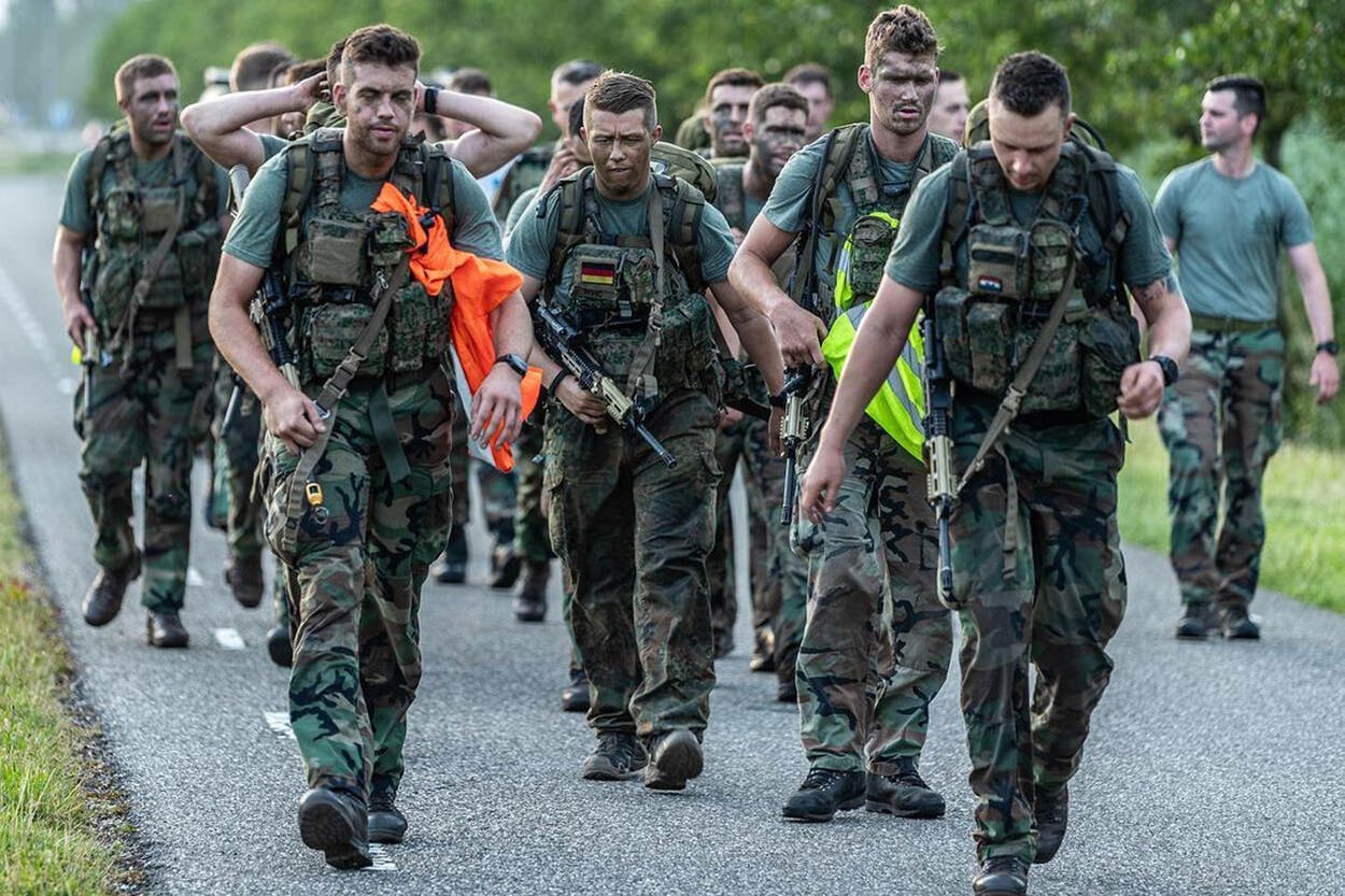 Het Duitse woord voor uitgeput is 'erschöpft'. En zo ziet de Duitse kapitänleutnant (kapitein) Christoph Wind van er inderdaad een beetje uit. Hij is de eerste buitenlandse officier die de Praktische Opleiding Tot Officier der Mariniers, beter bekend als POTOM, heeft afgerond. En dus wachtte hem, net als zijn Nederlandse collega's, na negen maanden afzien een feestelijke binnenkomst op de Rotterdamse Van Ghentkazerne. Herzlichen Glückwunsch! Foto: Defensie