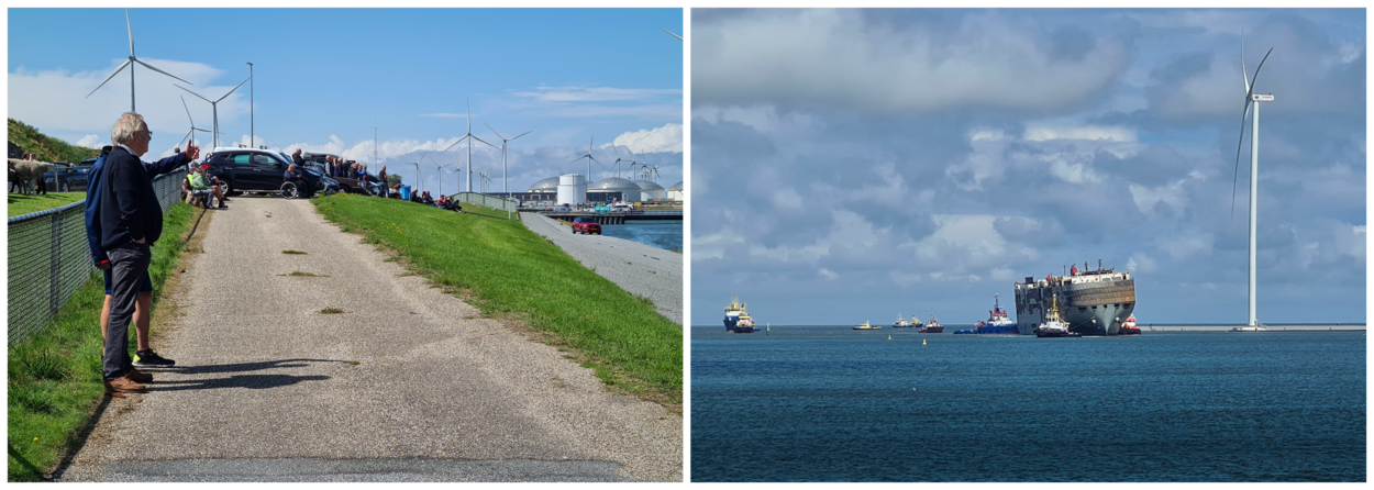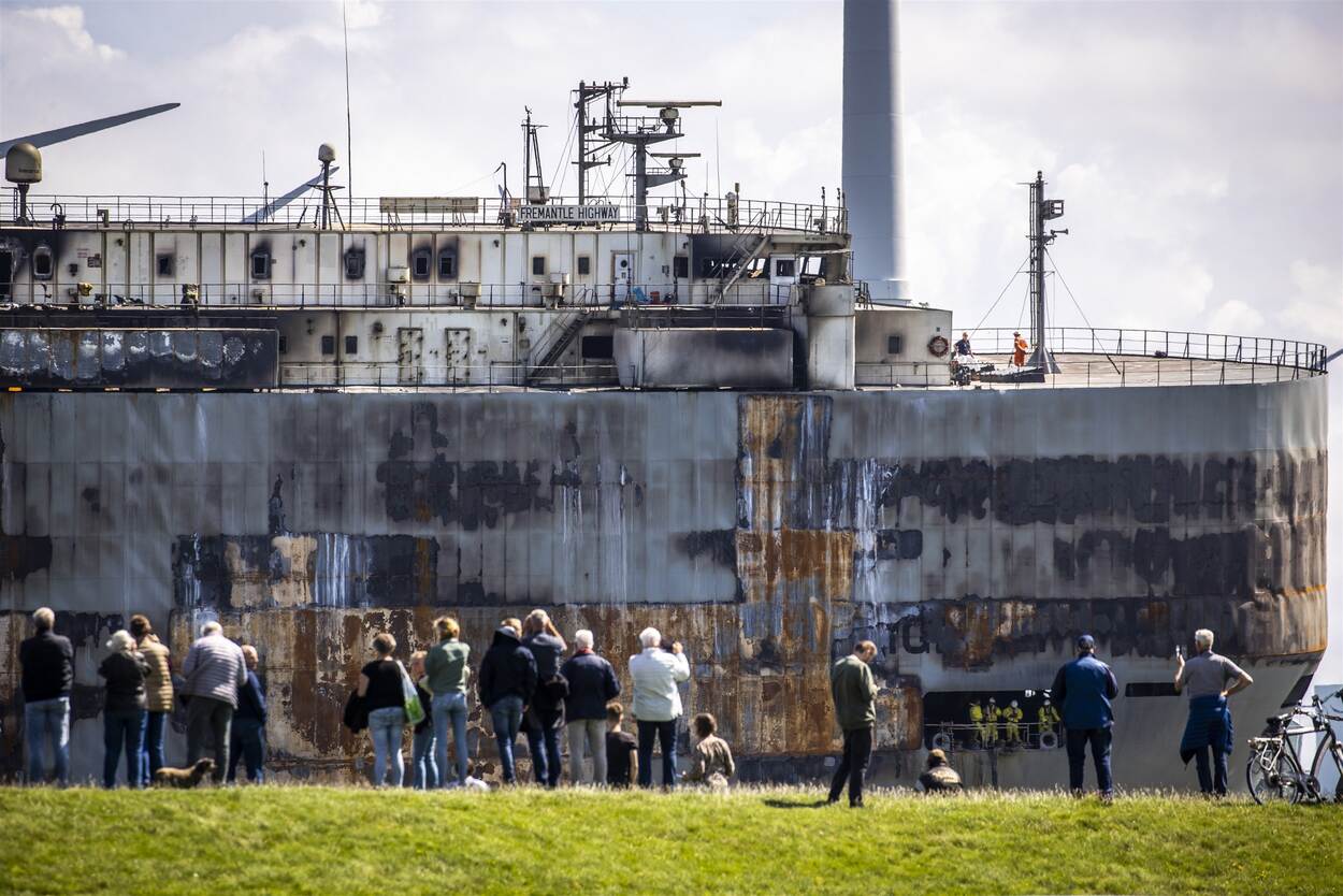 Voor veel belangstellenden was het een fijn dagje uit. Voor het Korps Marinebrandweer (KMB) een serieuze inzet: de aankomst van het door brand getroffen vrachtschip Fremantle Highway, gistermiddag in de Noord-Groningse Eemshaven.