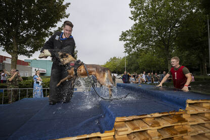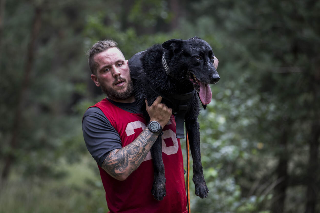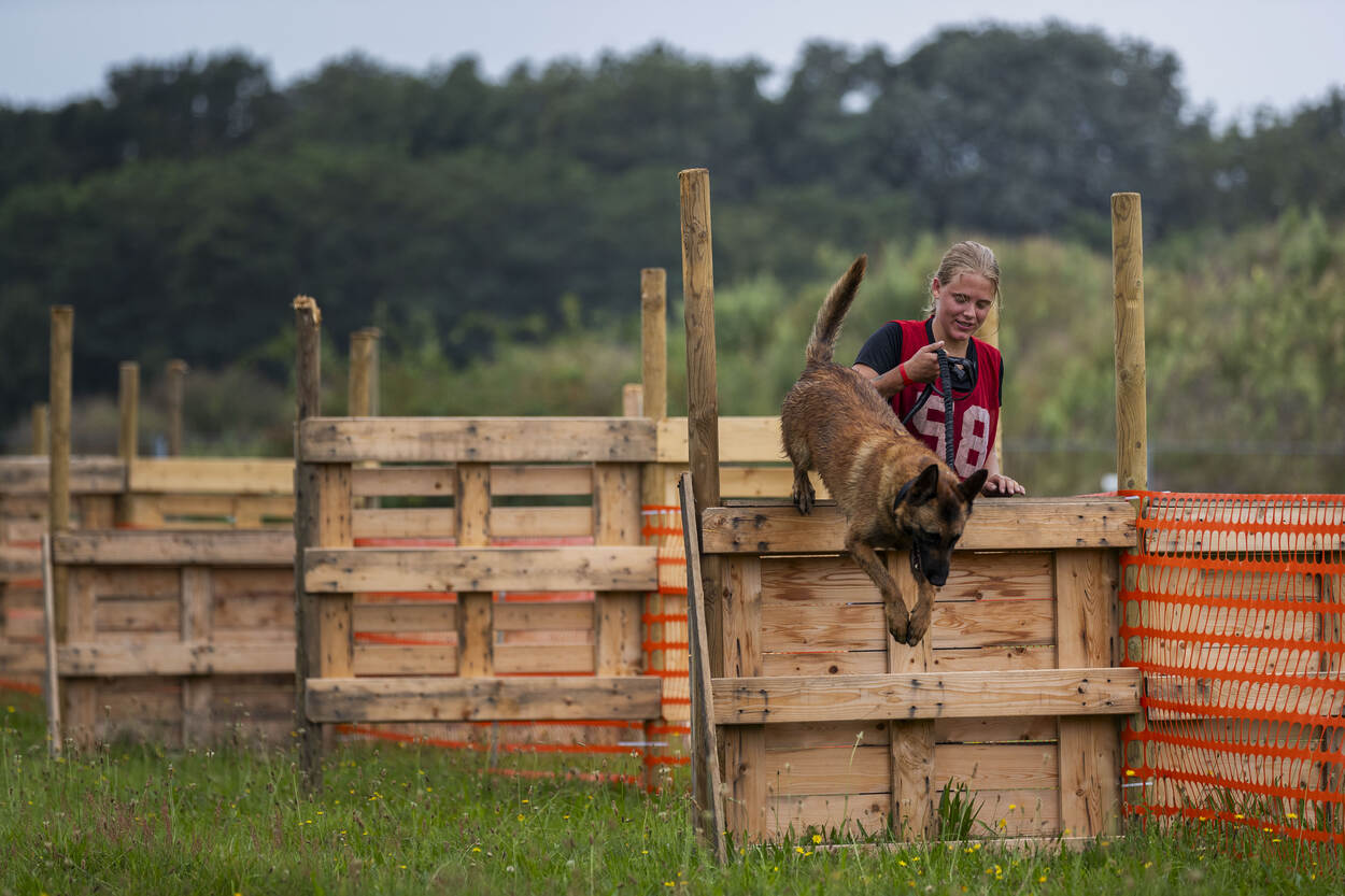 Voor zich ziet de hondenbegeleider een kist van twintig kilo, met daaraan twee touwen. De man staat nog op adem te komen van het oversteken van de sloot. De modderige bodem heeft de benen flink verzuurd. Zijn trouwe viervoeter stuitert vrolijk naast hem op en neer. De ogen strak op de baas gericht, klaar voor de volgende opdracht. Tip van de jury? “Maak het touw niet te lang, daar wordt de opdracht alleen maar zwaarder van.” En daar gaat het 'dierlijke duo'. Ze trotseren hindernis veertien. Nog maar zestien te gaan.