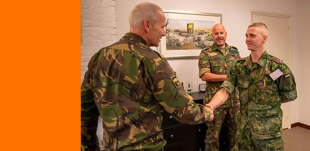 Uit handen van de commandant van 13 Lichte Brigade, brigadegeneraal Gert-Jan Kooij ontving soldaat Leon van 30 Natresbataljon gisteren de 'Commanders Coin' voor zijn kordate optreden bij een verkeersongeval begin dit jaar.