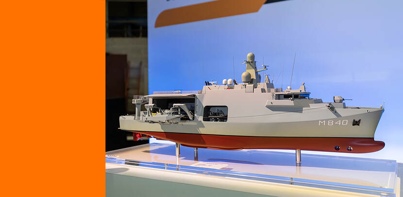 Nederland en België hebben twaalf nieuwe mijnenbestrijdingsvaartuigen in bestelling. Als eerste werd begin dit jaar de voor onze zuiderburen bestemde Oostende te water gelaten. Aan het einde van deze maand wordt de tewaterlating van de Vlissingen verwacht, het eerste schip voor de Nederlandse marine. Op de foto een model hiervan.
