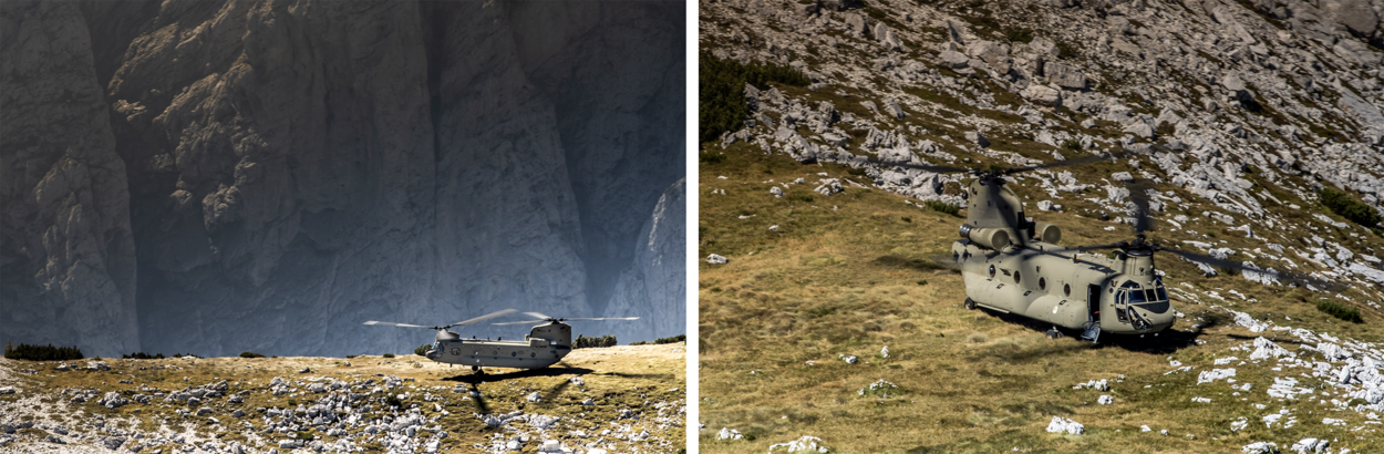 Sjors vertelt dat vliegen in berggebied uiteraard een operationeel doel heeft. Door zo dicht mogelijk bij de bergen te blijven, is een Apache minder goed zichtbaar wanneer hij een doel nadert. De transportheli's leggen zich in de bergen meer toe op het afzetten en oppikken van personeel. Met de Chinook, de NH90 en de Cougar trainen de cursisten vooral opstijgen en landen. Daarbij moeten zij rekening houden met een verschijnsel dat van invloed kan zijn op het draagvermogen. Wervelen hete verbrandingsgassen van de motoren in de richting van de staartrotor; dit kan de stabiliteit van het toestel negatief beïnvloeden.