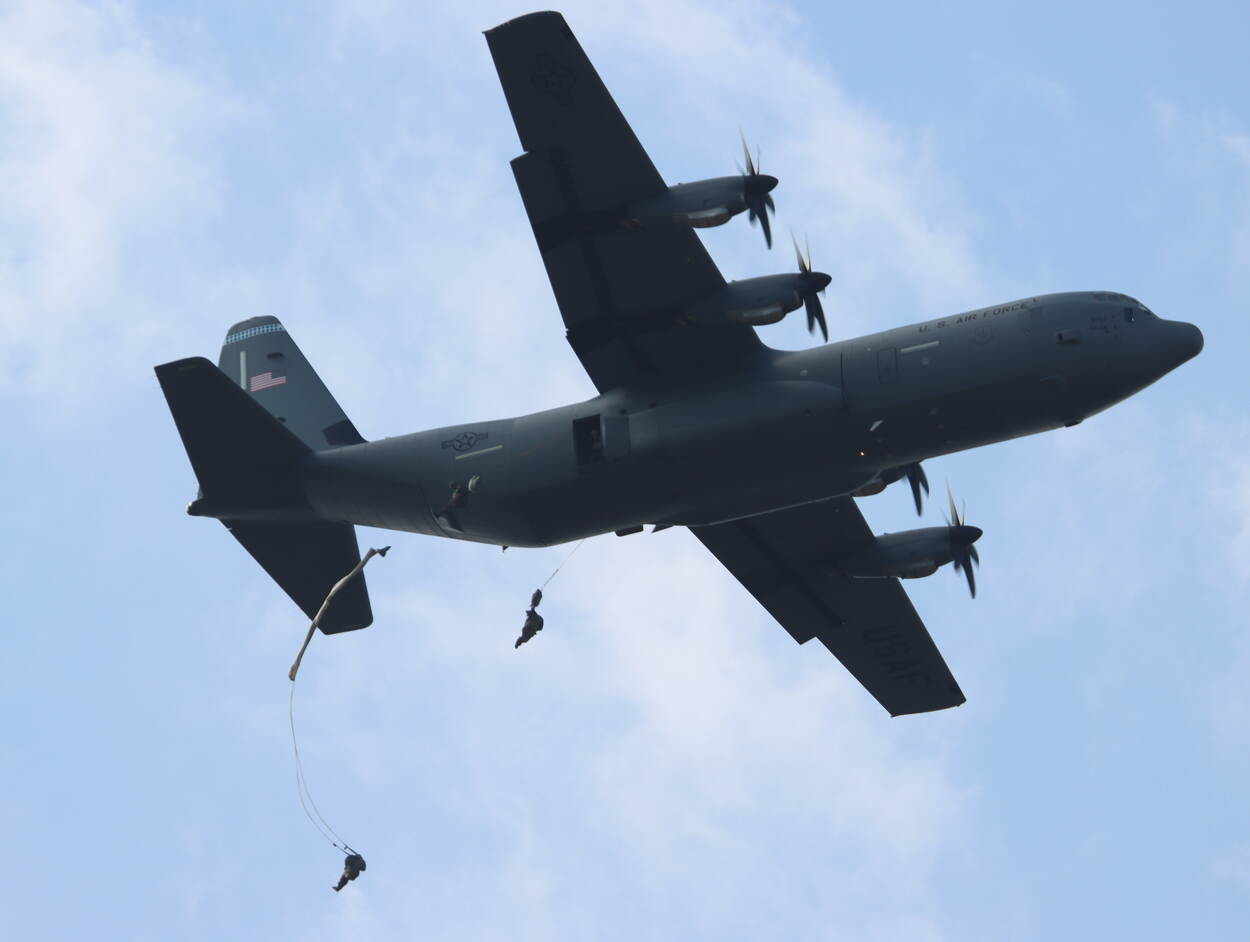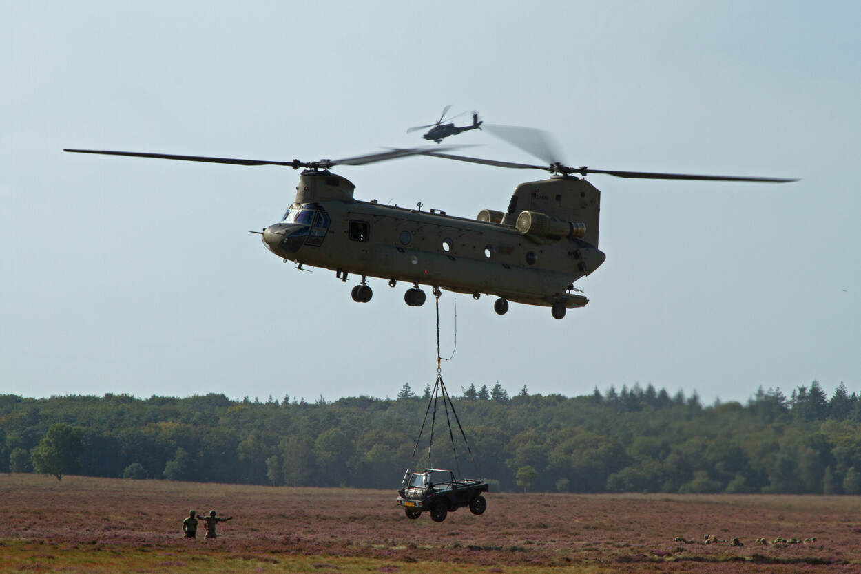 Nog eentje dan van de herdenking Operatie Market Garden. Een foto van een slingload, waarbij een voertuig wordt gelift door een Chinook CH-47F van 298 Squadron van Vliegbasis Gilze-Rijen. Op de achtergrond een Apache. En voor de echte fototechneuten onder ons: het beeld werd door sergeant-majoor John Kok genomen met een brandpunt van 105mm, f/18, sluitertijd 1/80 sec, ISO 100.