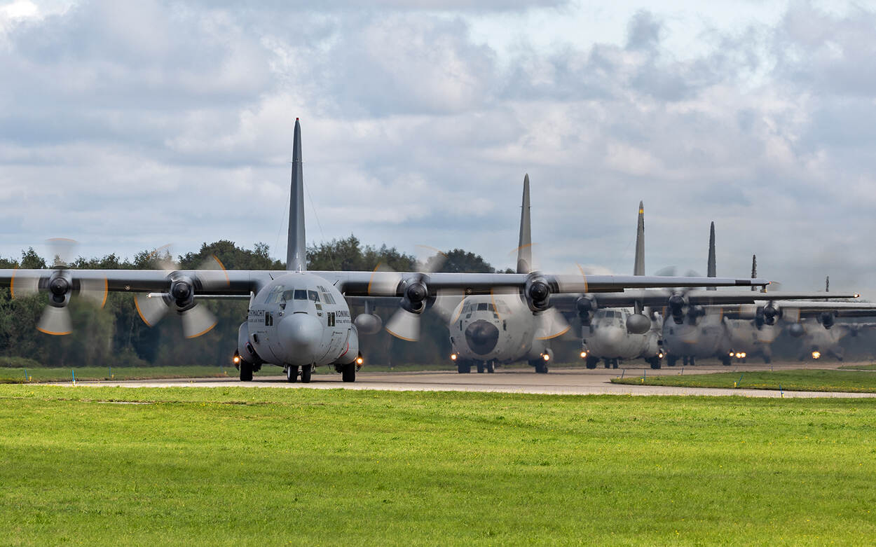 Een groot aantal luchtmachtfoto’s deze week. Bert van der Linden uit Wijk bij Duurstede maakte dit beeld vorige week woensdag bij Vliegbasis Eindhoven. Zes deelnemers aan de oefening Falcon Leap staan op de startbaan in de zogenoemde ‘elephant walk’ klaar voor vertrek.