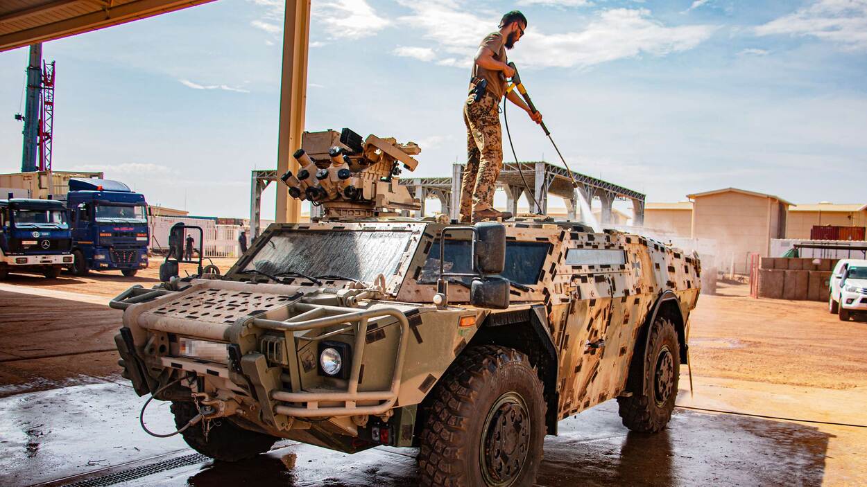 Op Camp Castor in Gao (Mali) neemt een soldaat van de Duitse Bundeswehr de hogedrukspuit ter hand om een Fennek ‘schön sauber zu machen’. Het Duitse materiaal gaat retour naar de thuisbasis en dat transport dient er natuurlijk wel netjes uit te zien! (foto: Maik Hörhold, Bundeswehr)