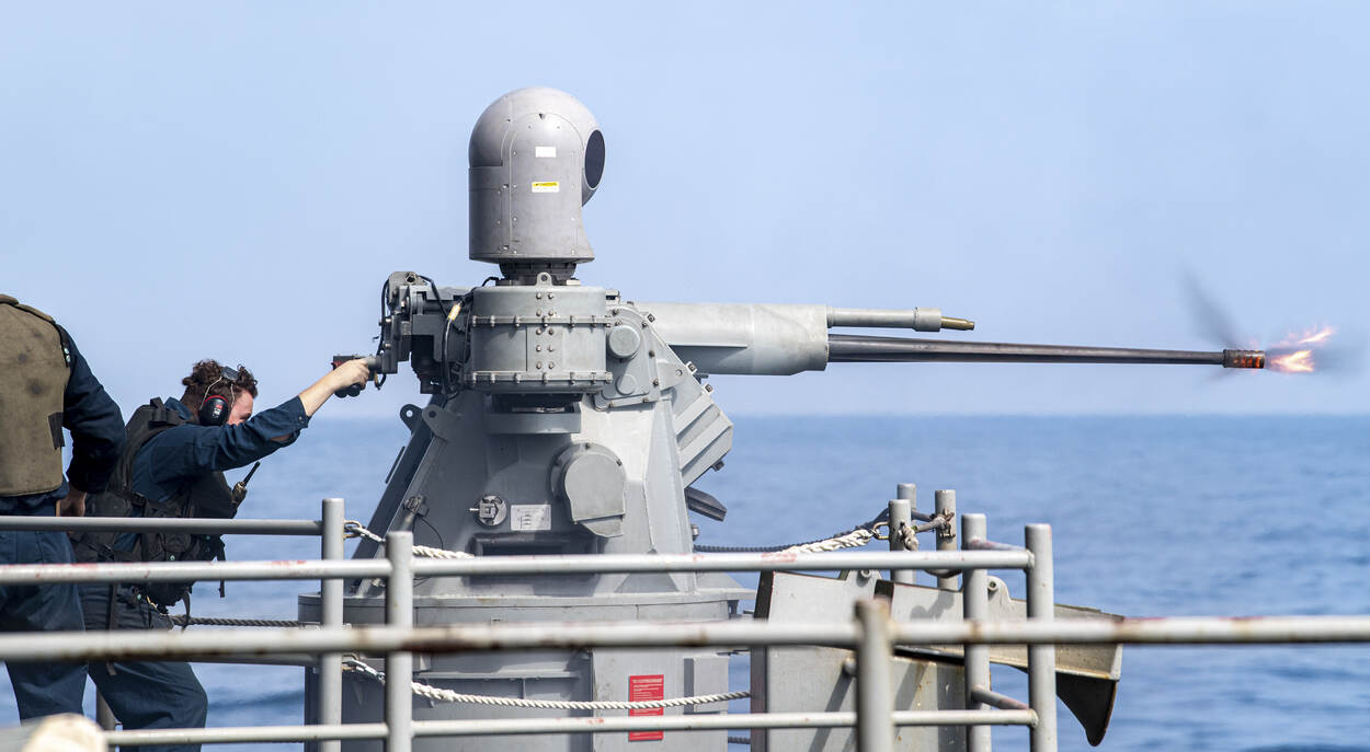 Daar heb je wel gehoorbescherming bij nodig! Gunner's Mate 2nd Class Kyle Szostkiewicz knalt er lustig op los. De matroos vuurt met een Mark 38 25mm machinegeweer tijdens een live fire schiettraining aan boord van het vliegdekschip USS Nimitz (CVN 68), momenteel onderweg ‘ergens in de Stille Oceaan’. (foto: David Rowe, U.S. Navy)