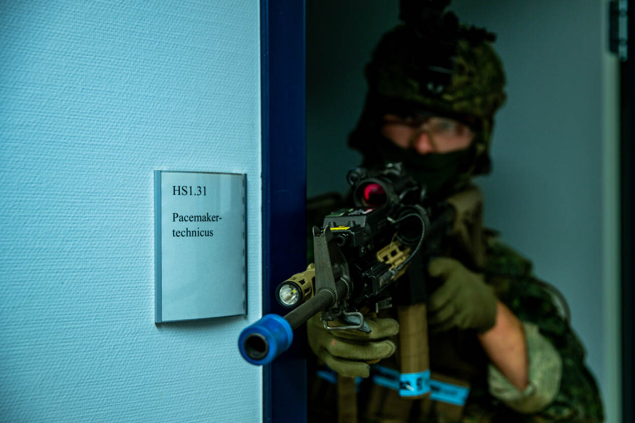 “En wij maken hier graag gebruik van”, benadrukt troopcommander eerste luitenant der mariniers Gijs. “Steeds vaker vindt ons optreden plaats in verstedelijkt gebied, ofwel Military Operations in Urban Terrain (MOUT). Een civiel ziekenhuis dat tot voor kort nog in gebruik was, simuleert dat heel goed.”