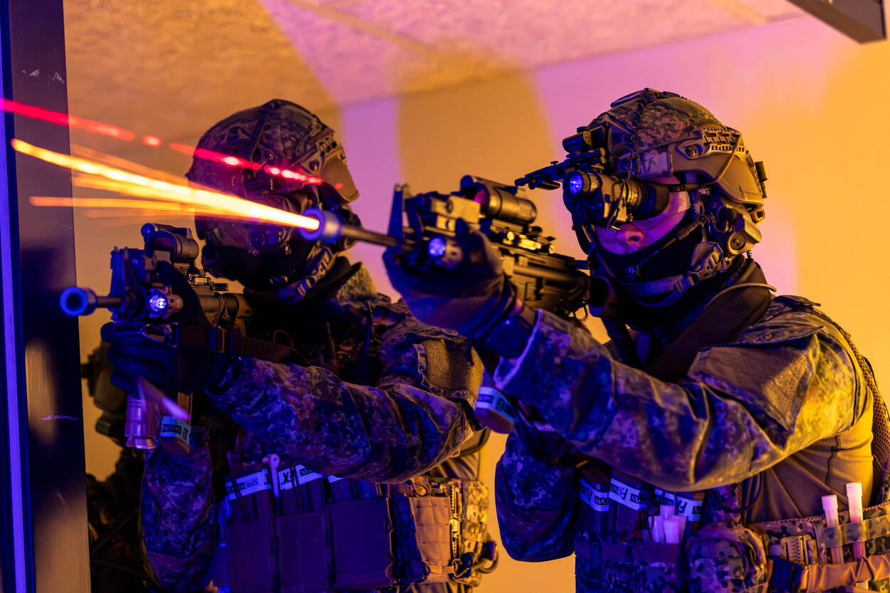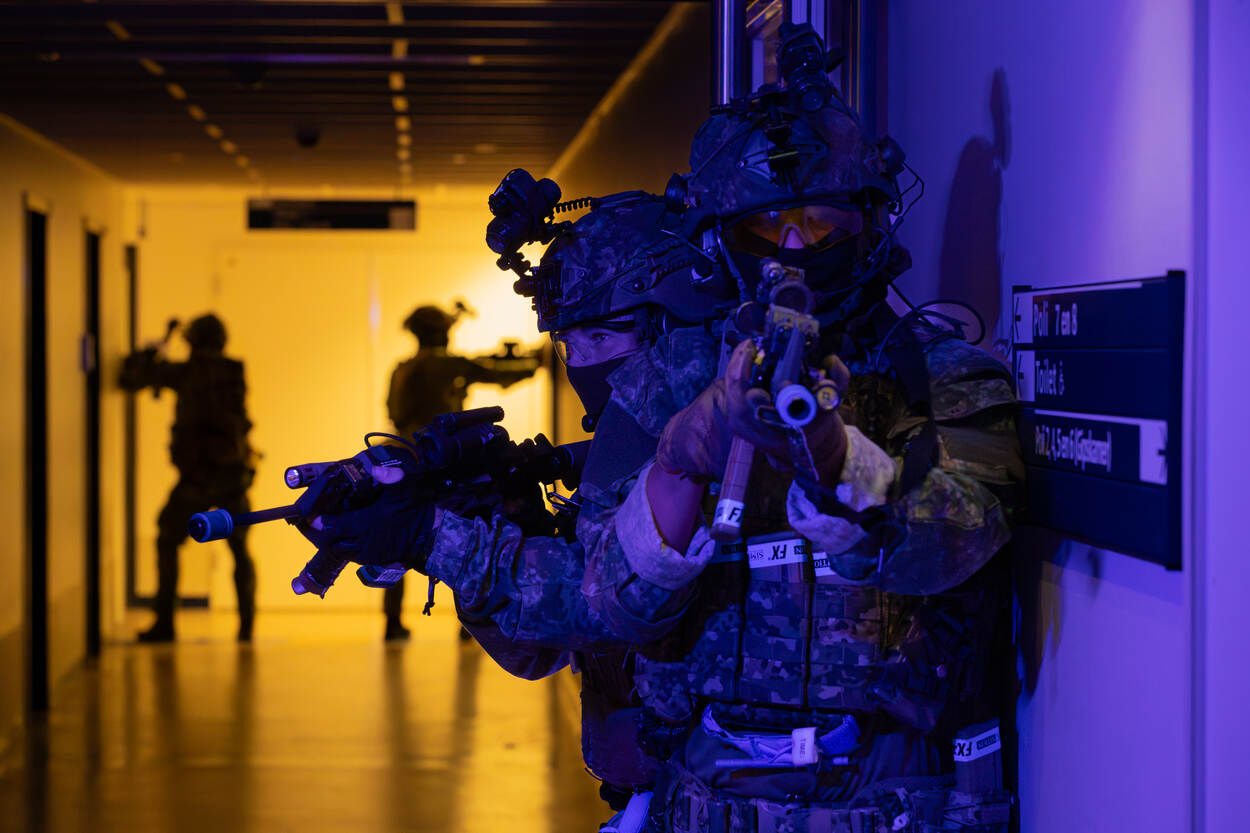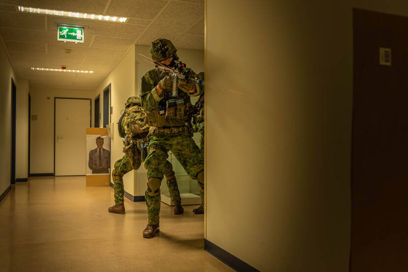 Termen vliegen om de oren; freeze right move left, room clear, tango down, show me your hands...! Ondertussen wordt bij iedere deurpost een groen breeklicht neergelegd, zodat het voor de collega’s duidelijk is welke kamers al veilig verklaard zijn. “En wanneer ze moeten terugtrekken markeren die lichten de route terug”, vult luitenant Gijs aan.