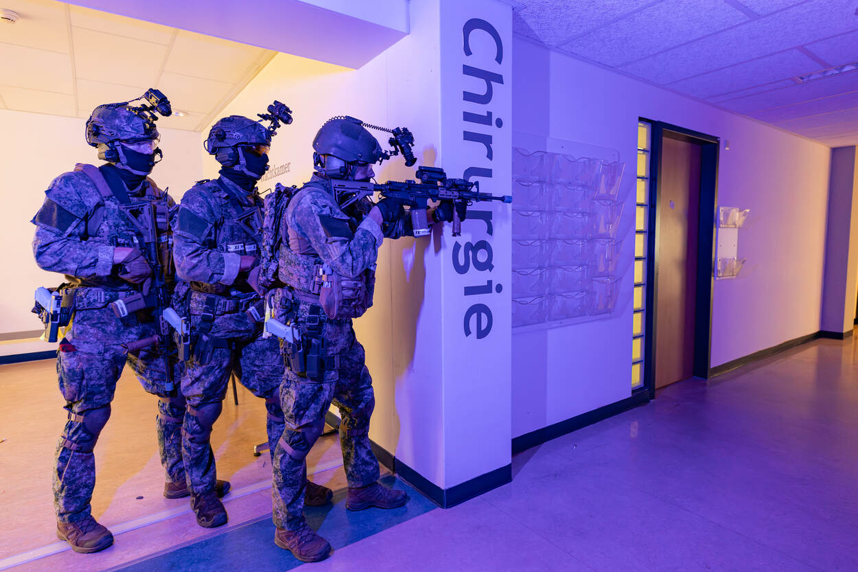 Het oude TerGooi ziekenhuis in Blaricum werd deze week omgetoverd tot militaire oefenlocatie. Geen patiënten met klachten of geneeskundig personeel in witte jassen, maar volledig omgehangen mariniers van 12 Raiding Squadron in de verlaten gangen, poliklinieken en slaap- en spreekkamers. De training is een voorbereiding op eventuele inzet van de Marine Spearhead Task Unit die binnen 48 uur overal ter wereld ingezet kan worden en waarvoor deze militairen stand-by staan. Zoals recent in Soedan.