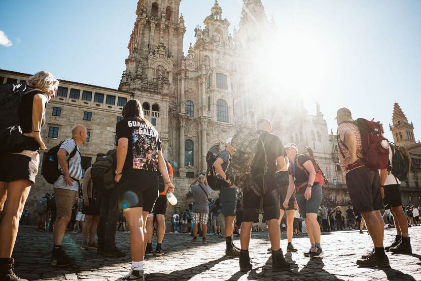 Na zo’n 3,5 uur druppelt iedereen geleidelijk binnen op het eindstation: het grote centrale plein voor de kathedraal van Santiago de Compostela. Volgens de legende liggen onder deze kathedraal de resten begraven van Christus’ apostel Sint-Jacobus, vandaar de sint-jakobsschelpen onderweg. Te midden van enkele honderden andere camino-wandelaars feliciteren de collega’s elkaar en worden dikke knuffels uitgewisseld. “Gefeliciteerd, goed gedaan!”. Wandelmissie voltooid.