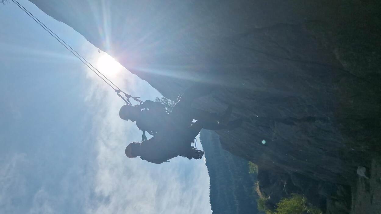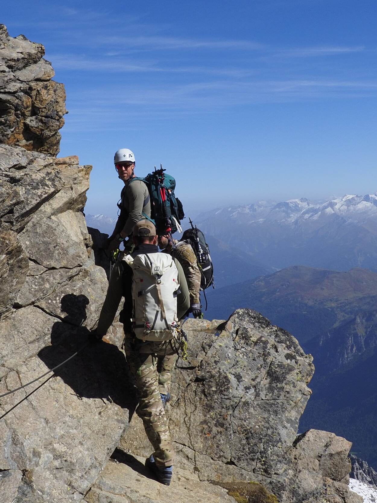 Door het tegenlicht is het beeld wat flets, maar sergeant-majoor Heesakkers van de LO & Sportorganisatie van de landmacht fotografeerde tijdens een alpine-reddingcursus in Frankrijk een sportinstructeur van dit krijgsmachtdeel. Bij wijze van oefening begeleidt die een ‘gewonde’ collega naar veiliger oorden. De opleiding stoomt de deelnemers fysiek en mentaal klaar voor operaties in het hooggebergte. Want dat leer je niet op een regenachtige zondagnamiddag uit een boek.